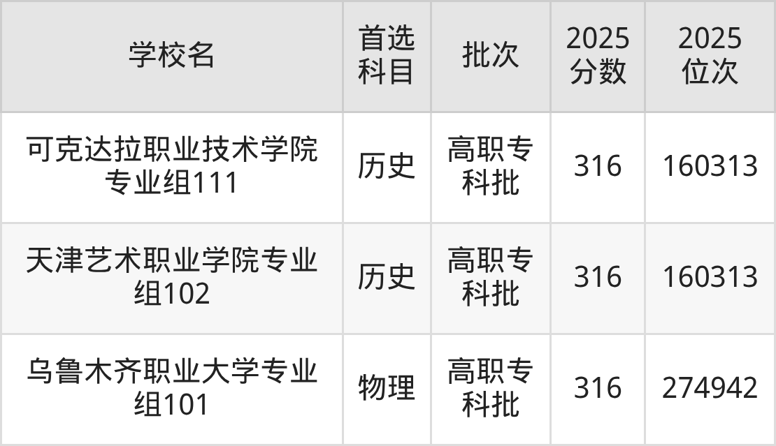 历史类316分能上的有可克达拉职业技术学院、天津艺术职业学院;物理类316分能上的有乌鲁木齐职业大学。