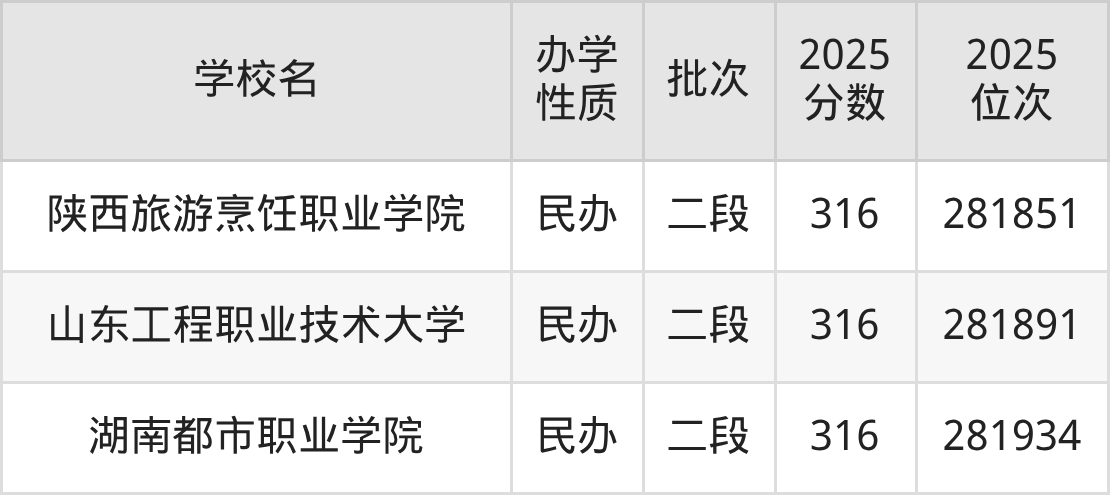 316分能上的大学中:民办的有陕西旅游烹饪职业学院、山东工程职业技术大学、湖南都市职业学院。
