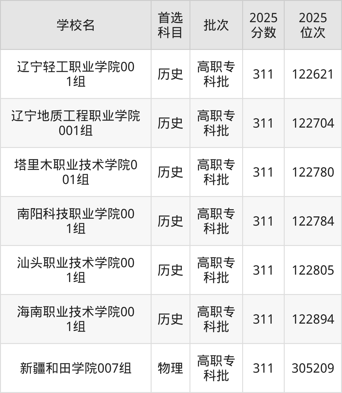 历史类311分能上的有辽宁轻工职业学院、辽宁地质工程职业学院、塔里木职业技术学院、南阳科技职业学院、汕头职业技术学院等;物理类311分能上的有新疆和田学院。