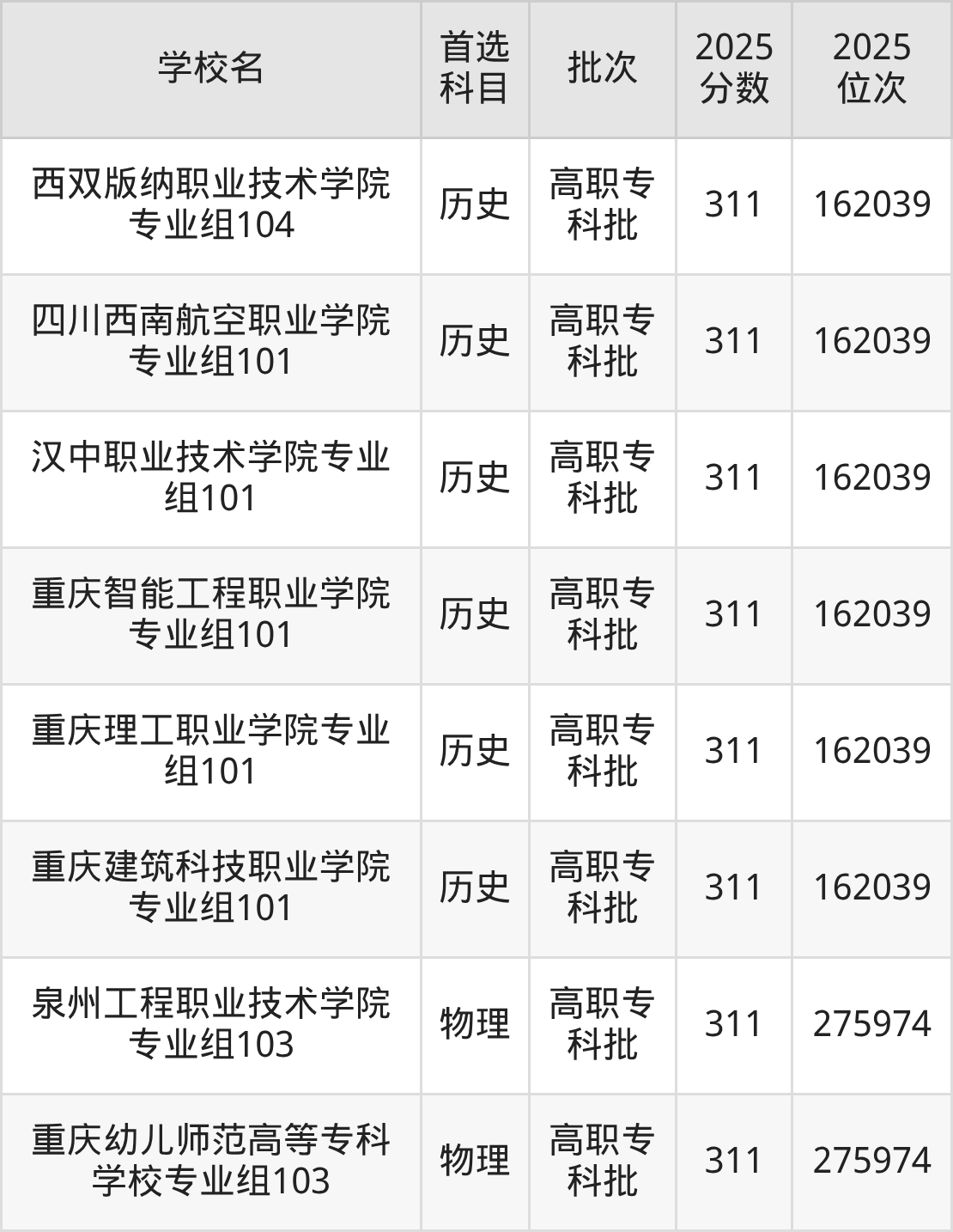历史类311分能上的有西双版纳职业技术学院、四川西南航空职业学院、汉中职业技术学院、重庆智能工程职业学院、重庆理工职业学院等;物理类311分能上的有泉州工程职业技术学院、重庆幼儿师范高等专科学校。