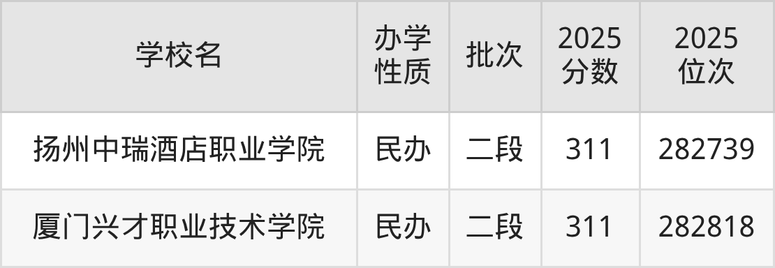 2025年浙江311分对应排名:282739名~282818名,因此建议2026年高考位次在28.3万名左右的考生报考这些学校。