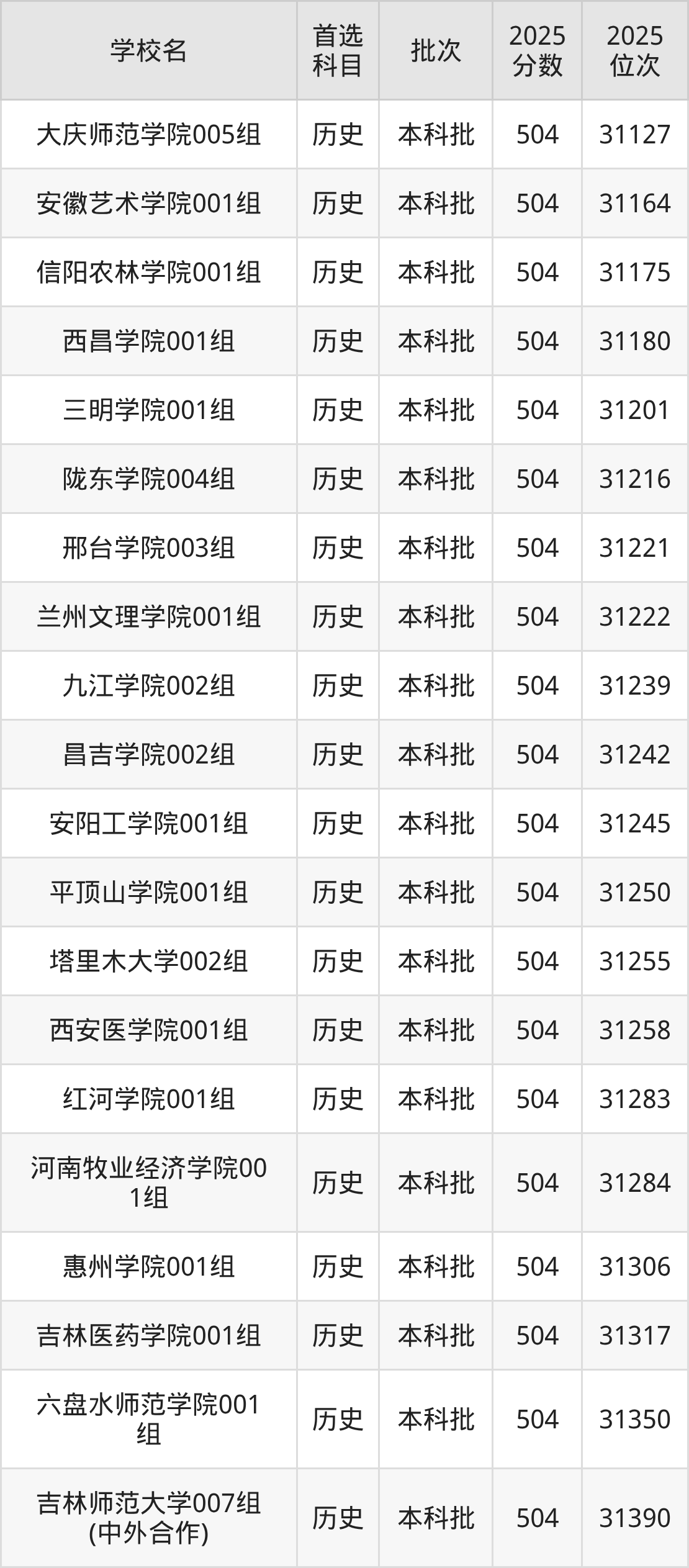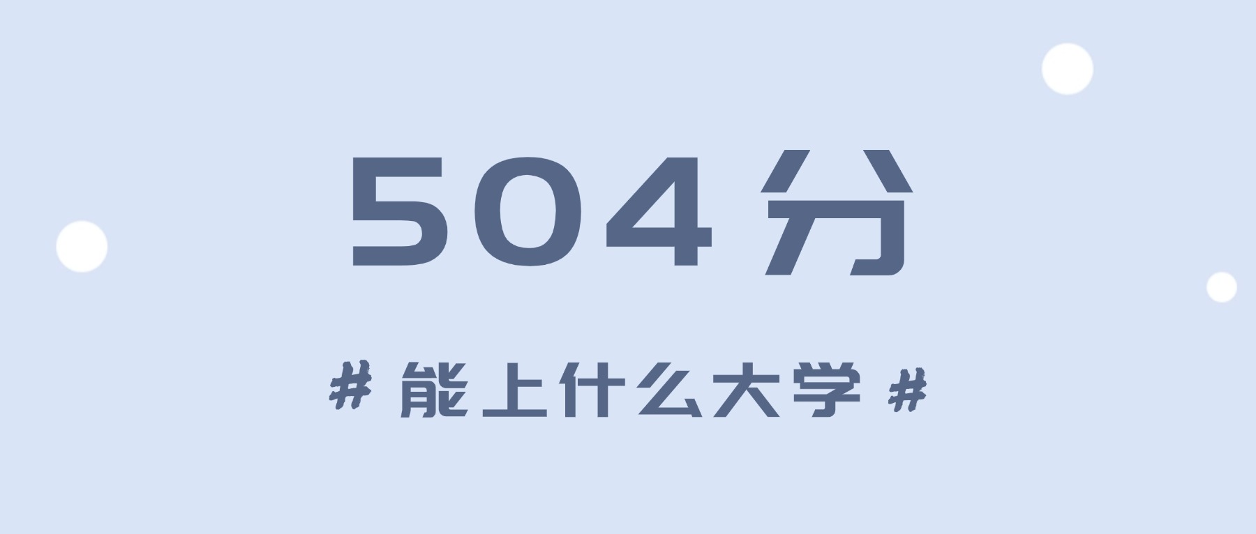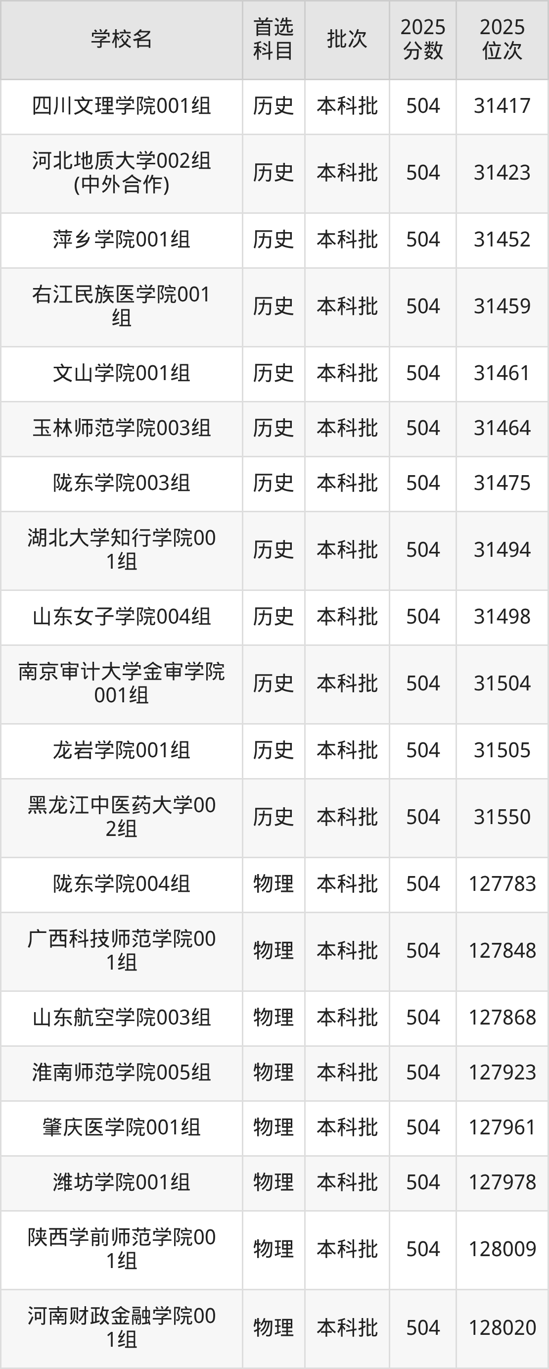 历史类504分能上的有大庆师范学院、安徽艺术学院、信阳农林学院、西昌学院、三明学院等;物理类504分能上的有陇东学院、广西科技师范学院、山东航空学院、淮南师范学院、肇庆医学院等。