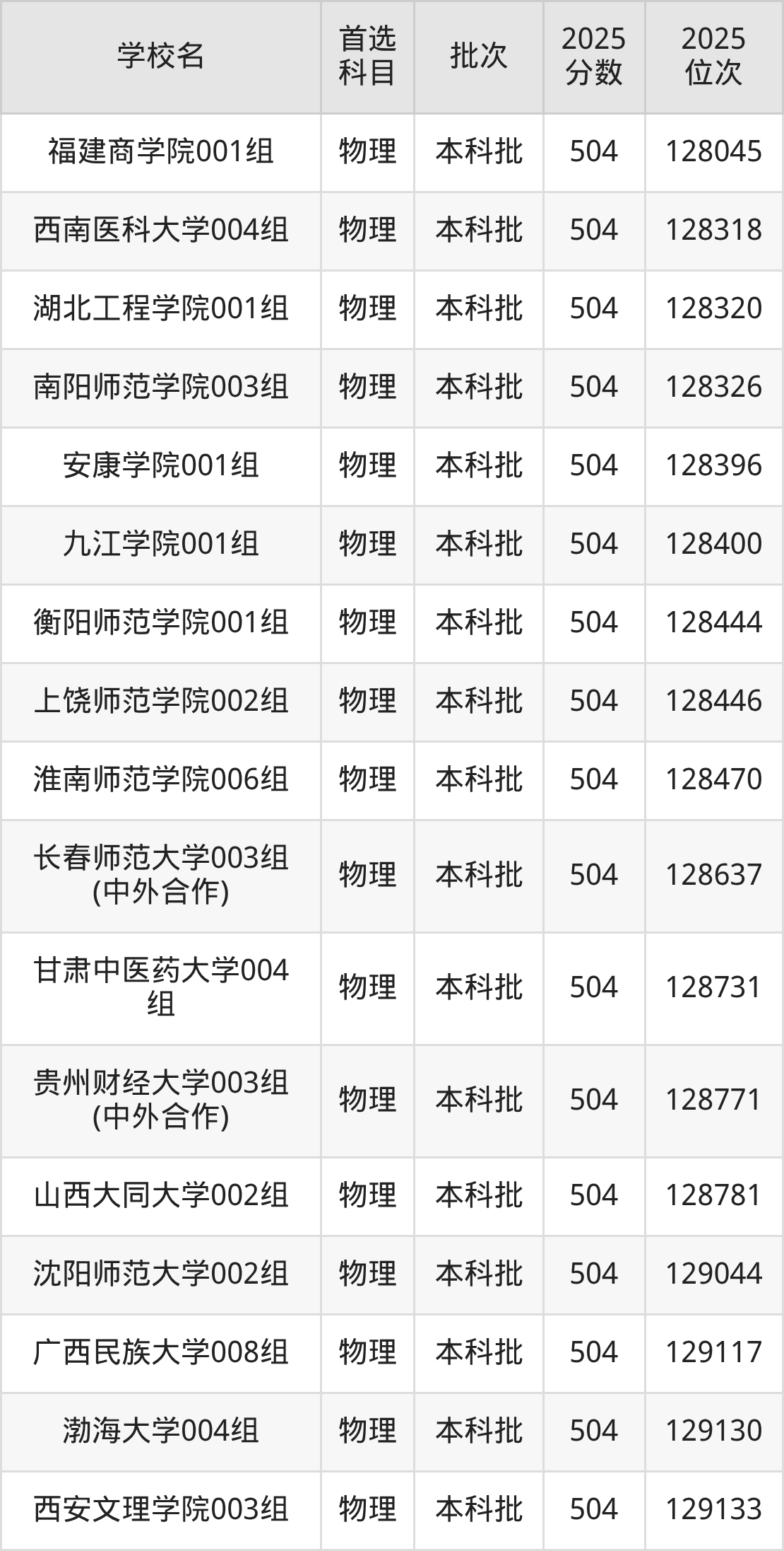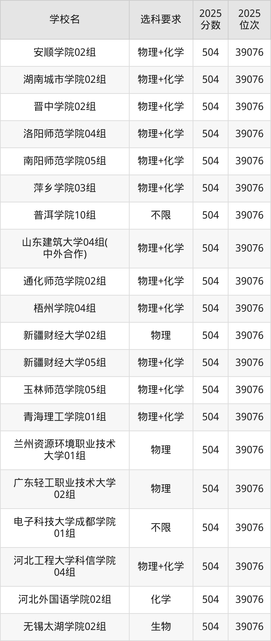 选科物理+化学的考生504分能上的大学有安顺学院、湖南城市学院、晋中学院、洛阳师范学院、南阳师范学院;504分“不限选科要求”的大学是普洱学院、电子科技大学成都学院、武汉学院;选科物理的考生504分能上的大学有新疆财经大学、兰州资源环境职业技术大学、广东轻工职业技术大学;选科化学的考生504分能上的大学有河北外国语学院、武昌理工学院;选科生物的考生504分能上的大学有无锡太湖学院。