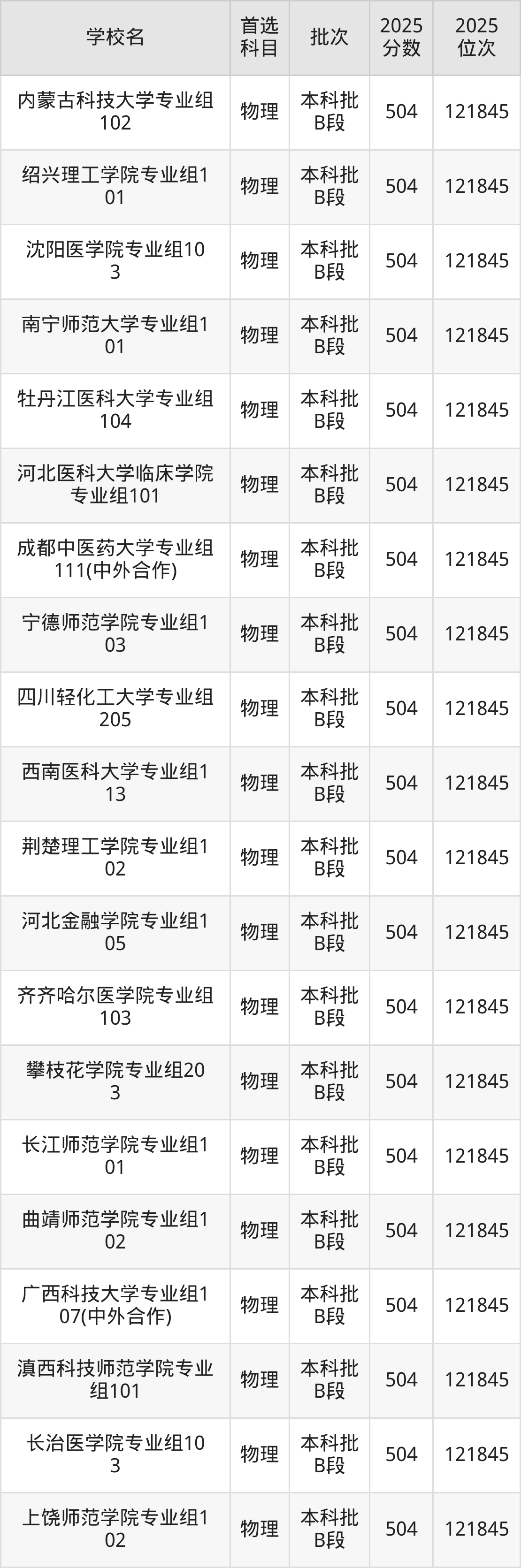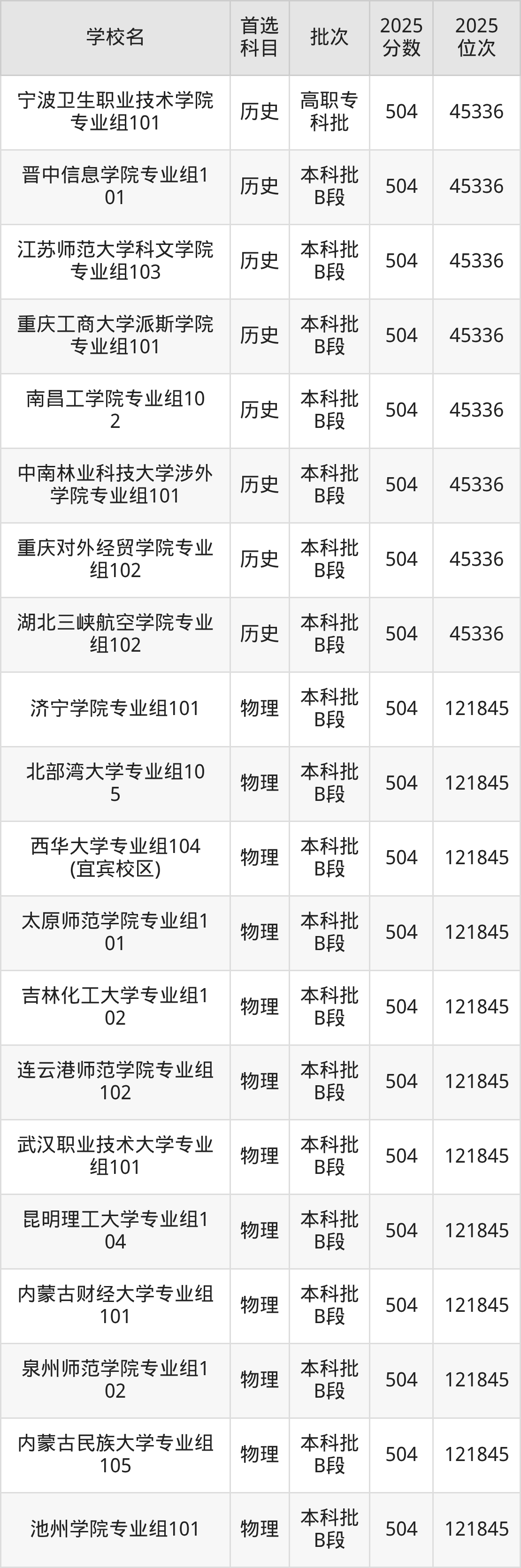 历史类504分能上的有宁波卫生职业技术学院、晋中信息学院、江苏师范大学科文学院、重庆工商大学派斯学院、南昌工学院等;物理类504分能上的有济宁学院、北部湾大学、西华大学、太原师范学院、吉林化工大学等。