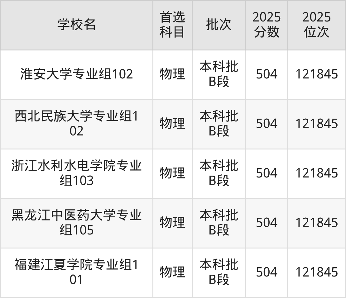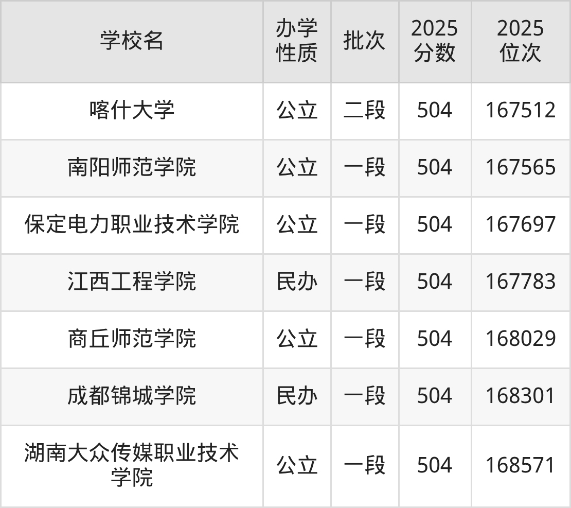 2025年浙江504分对应排名:167512名~168571名,因此建议2026年高考位次在16.9万名左右的考生报考这些学校。