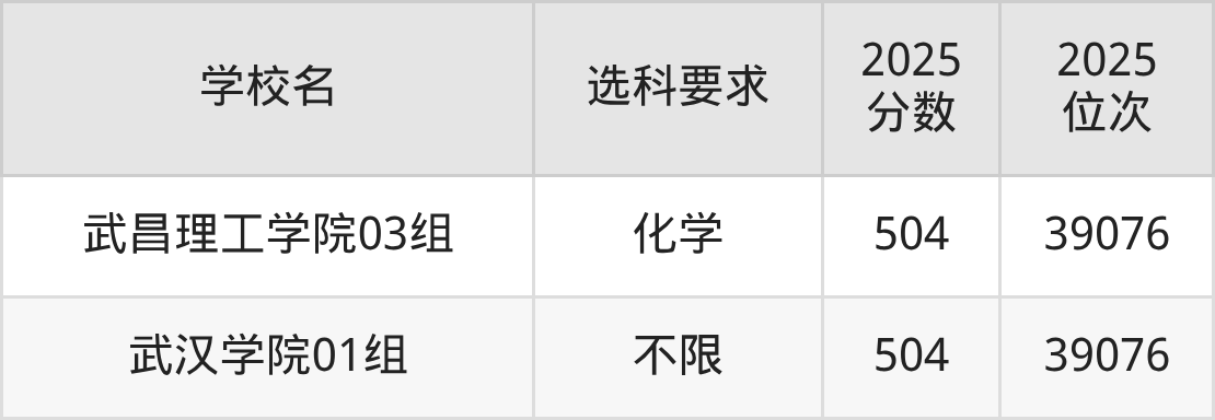 可见,选科组合不同能上的大学名单不同。选择物理+化学的考生,504分可以上公办本科。但其他选科组合的同学大概率只能报考民办本科。