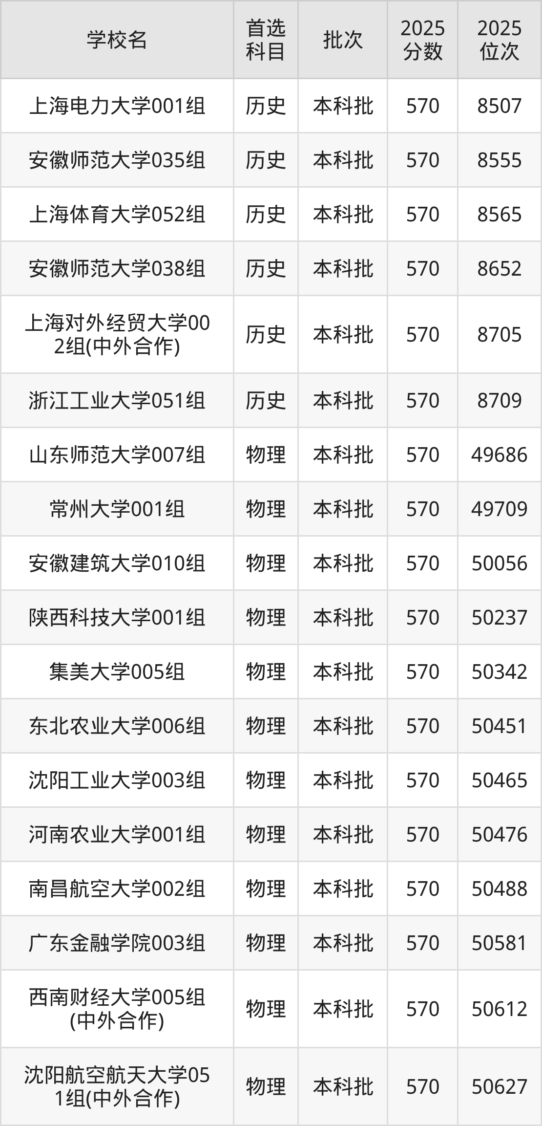 历史类570分能上的有上海电力大学、安徽师范大学、上海体育大学、上海对外经贸大学、浙江工业大学等;物理类570分能上的有山东师范大学、常州大学、安徽建筑大学、陕西科技大学、集美大学等。