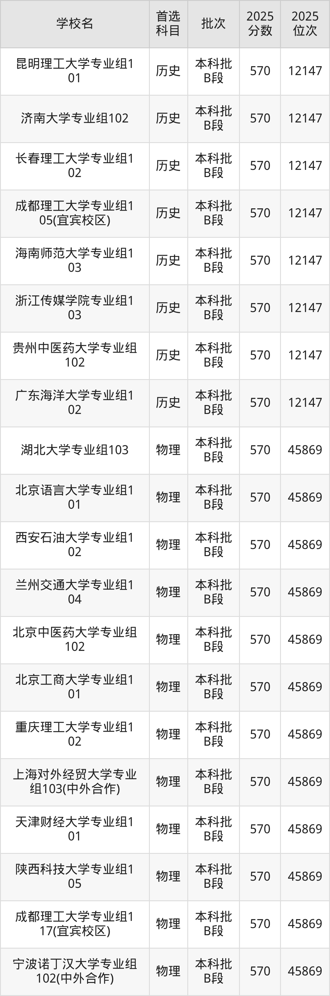 历史类570分能上的有昆明理工大学、济南大学、长春理工大学、成都理工大学、海南师范大学等;物理类570分能上的有湖北大学、北京语言大学、西安石油大学、兰州交通大学、北京中医药大学等。