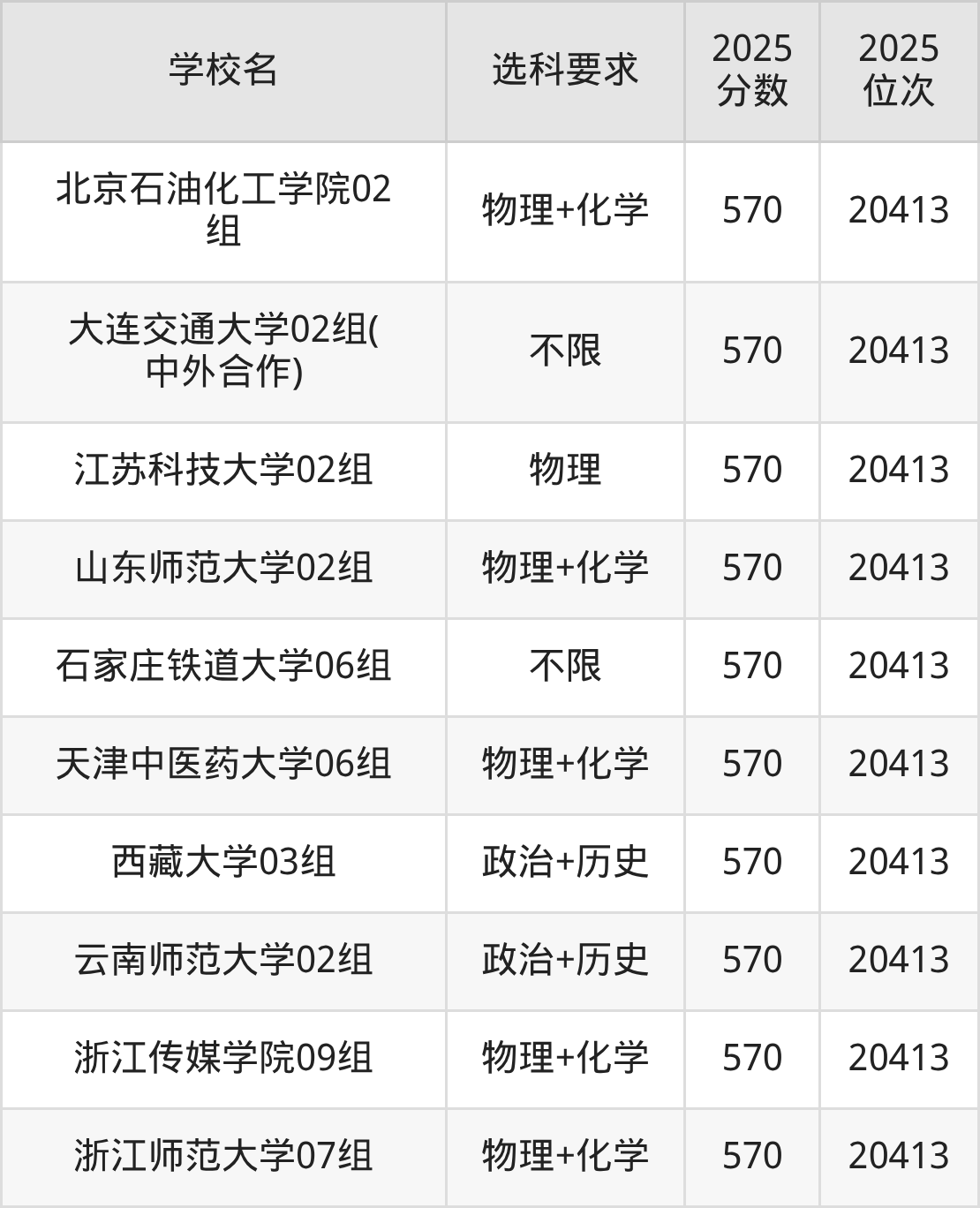 选科物理+化学的考生570分能上的大学有北京石油化工学院、山东师范大学、天津中医药大学、浙江传媒学院、浙江师范大学;570分“不限选科要求”的大学是大连交通大学、石家庄铁道大学;选科物理的考生570分能上的大学有江苏科技大学;选科政治+历史的考生570分能上的大学有西藏大学、云南师范大学。