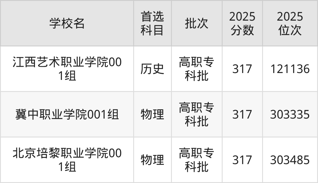 历史类317分能上的有江西艺术职业学院;物理类317分能上的有冀中职业学院、北京培黎职业学院。