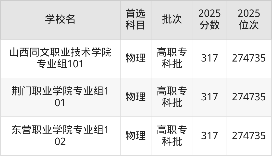 物理类317分能上的有山西同文职业技术学院、荆门职业学院、东营职业学院。