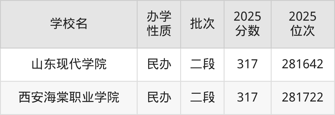 317分能上的大学中:民办的有山东现代学院、西安海棠职业学院。