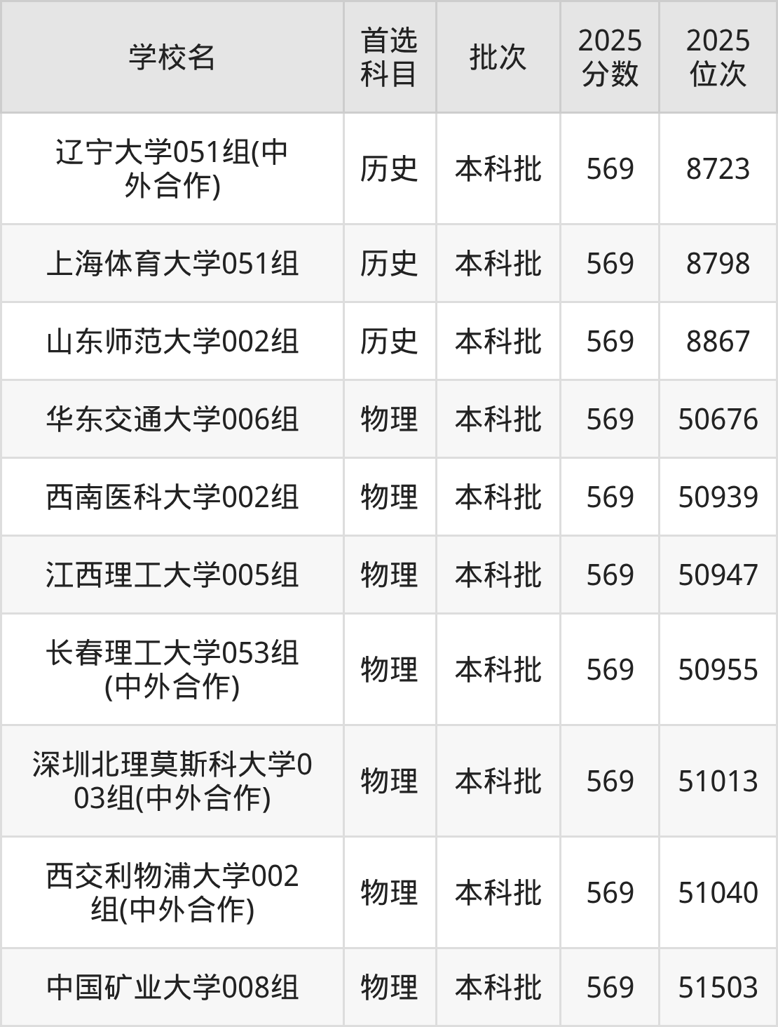 历史类569分能上的有辽宁大学、上海体育大学、山东师范大学;物理类569分能上的有华东交通大学、西南医科大学、江西理工大学、长春理工大学、深圳北理莫斯科大学等。