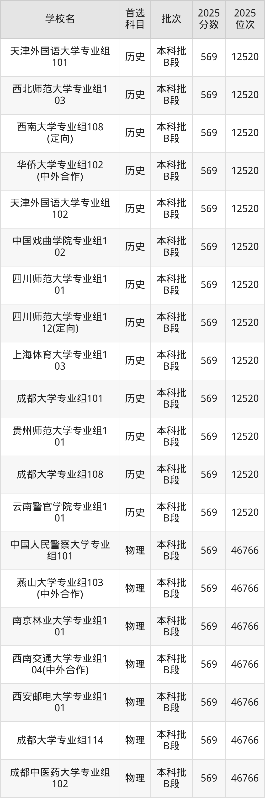 2025年四川569分对应排名:历史类12520名,物理类46766名。由于录取分数线波动较大,因此建议2026年高考位次排名在1.3万名或4.7万名左右的同学报考下表中的学校。