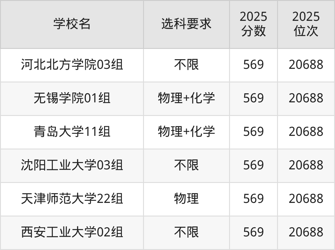 2025年天津569分对应排名:20688名,因此建议2026年位次排名2.1万名左右的同学报考这些学校。