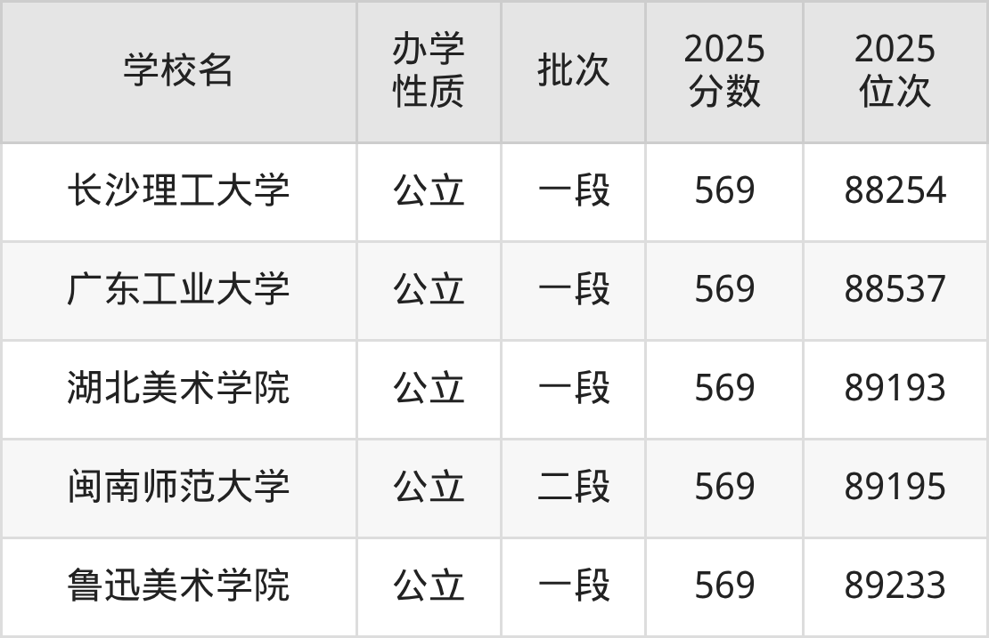 569分能上的大学中:公办的有长沙理工大学、广东工业大学、湖北美术学院、闽南师范大学、鲁迅美术学院。