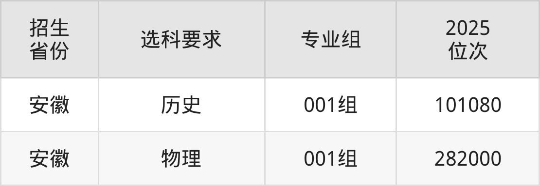 安徽艺术职业学院2025年的位次差异较大,最高位次是101080位(安徽历史类)、最低位次是282000位(安徽物理类)。具体位次请看下图: