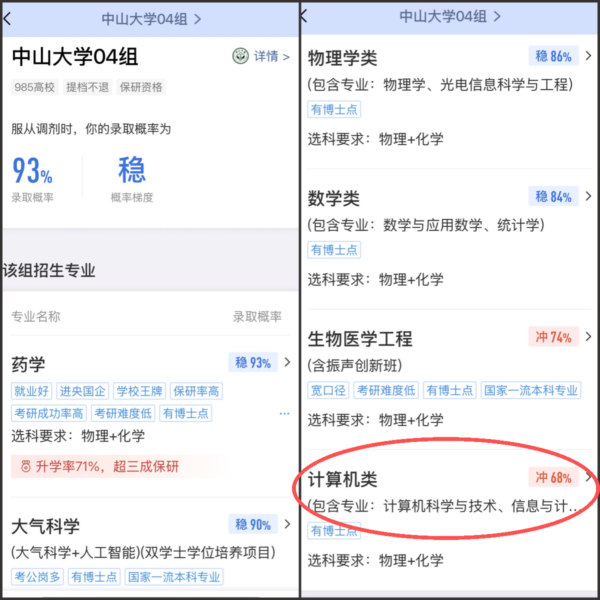 样例图中,中山大学04组录取概率是93%,但是组内招生专业之间最低分位次差异大。如果你的目标专业是6录取概率为68%的计算机类,该组就不适合你。如果你的目标专业是录取概率为84%的数学类专业,该组就比较适合你。