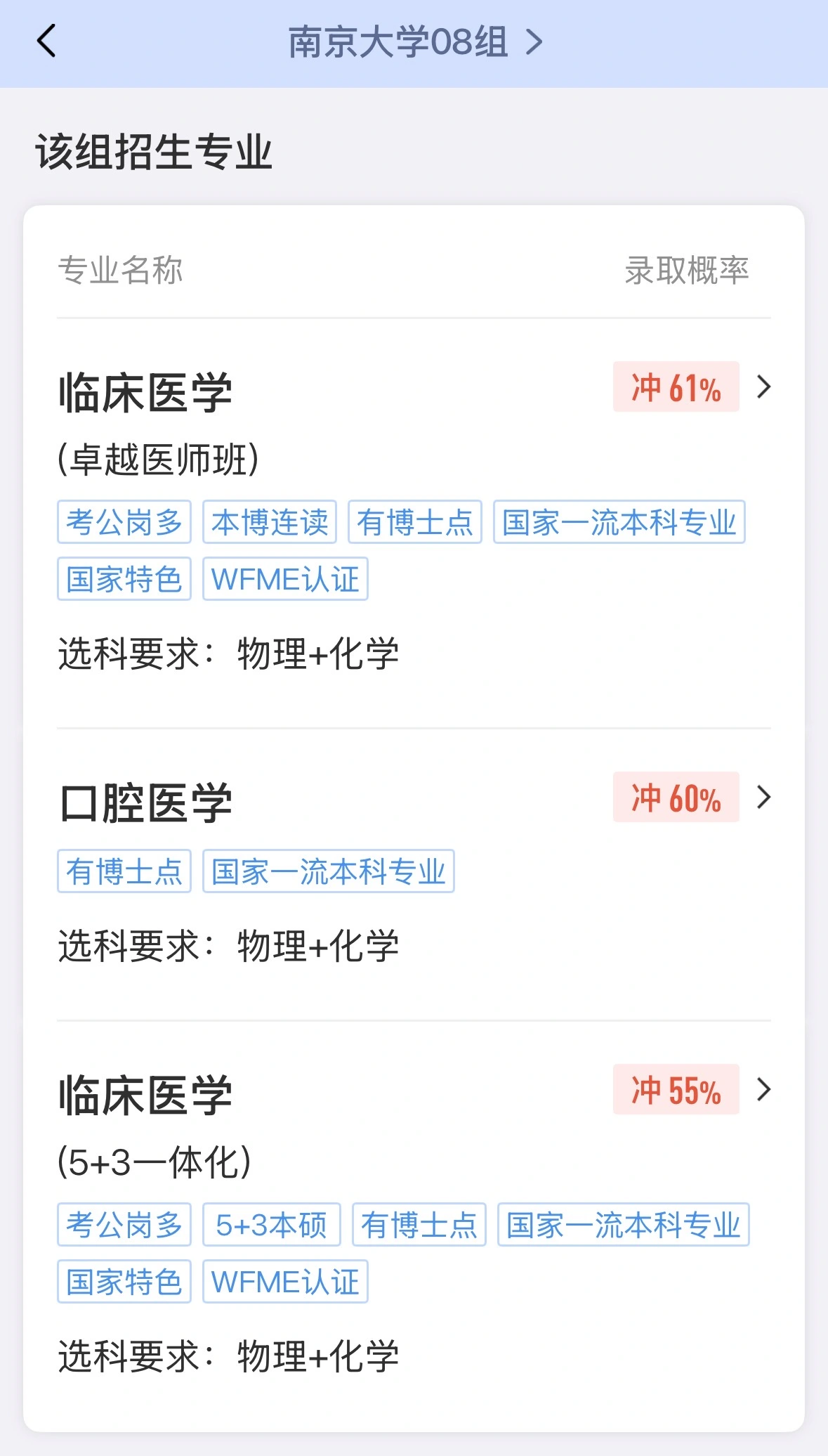 比如,若你的目标是学医,临床、口腔均可,那么便可放心冲一冲样例图中的“南京大学08组”。