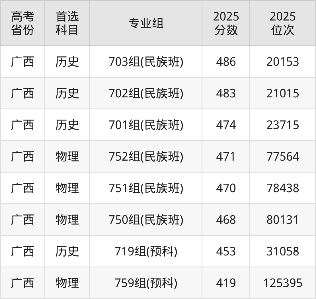 下方图片展示的是广西民族师范学院少数民族预科班2025年录取分数线汇总: