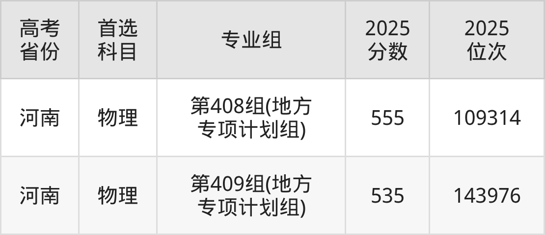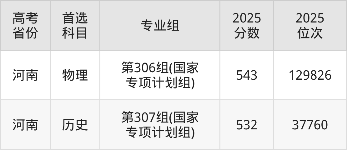 | 高考 省份 | 专业组 | 选科要求 | 2025 分数 | 2025 位次 |