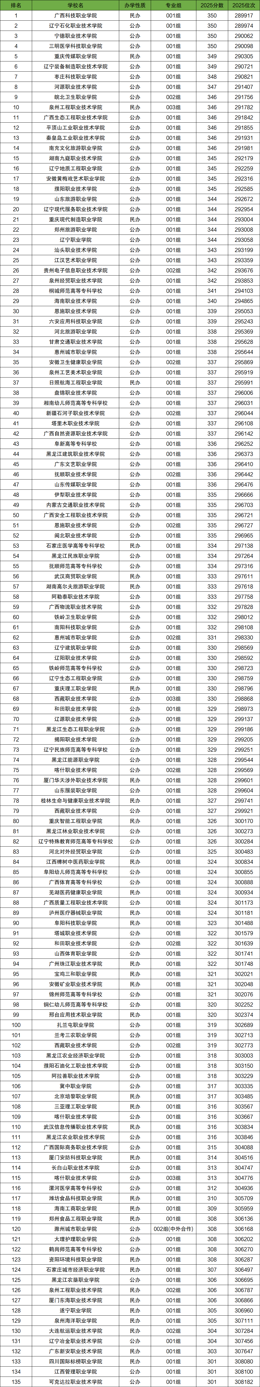 下方表格以安徽高考物理类2025年的招生情况为例,展示了全国300到350分的专科大学最低录取分数线排名,共计127所(135个院校专业组),供2026年高考生参考!