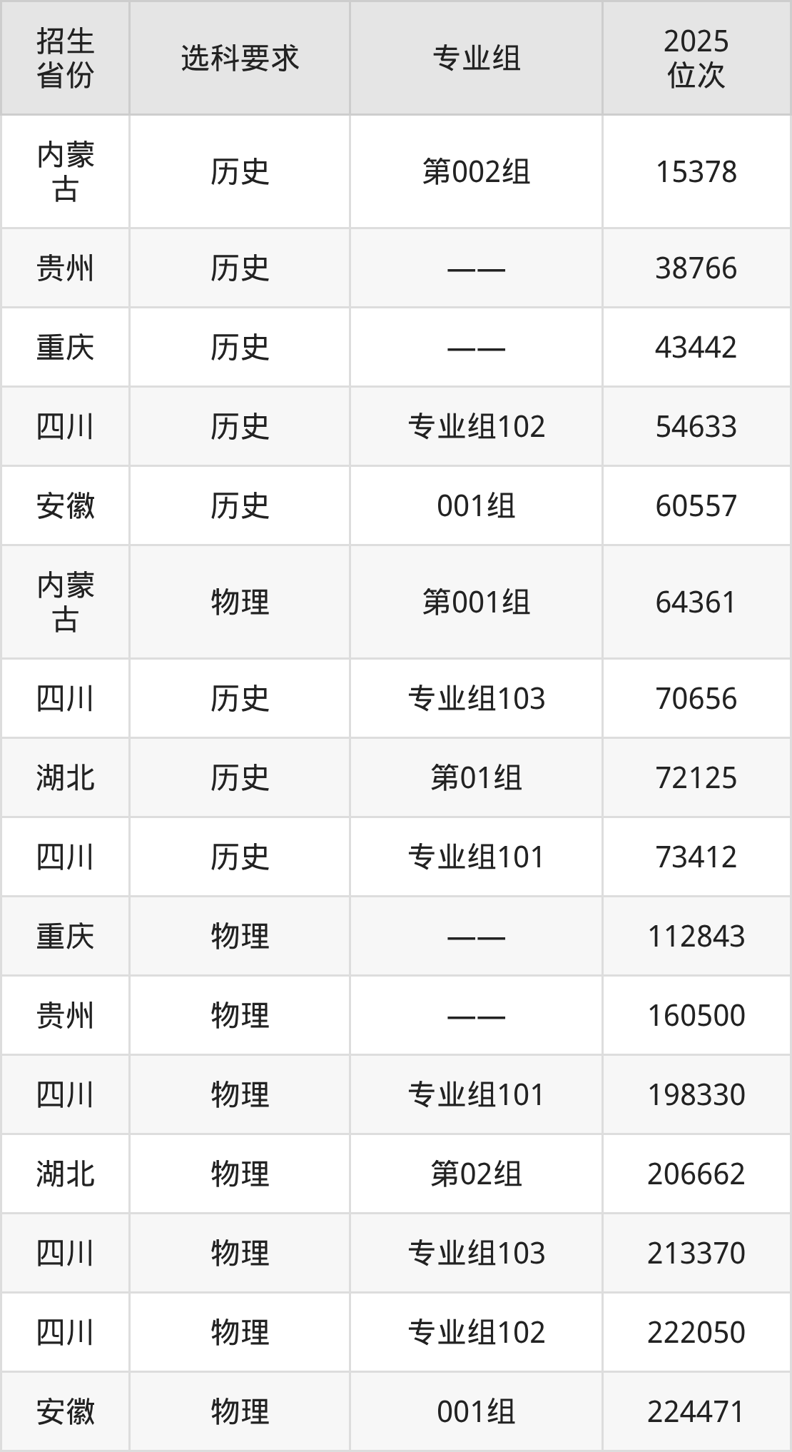 成都农业科技职业学院2025年在全国各省的位次差异较大,最高位次是15378位(内蒙古历史类)、最低位次是224471位(安徽物理类)。各省具体位次请看下图: