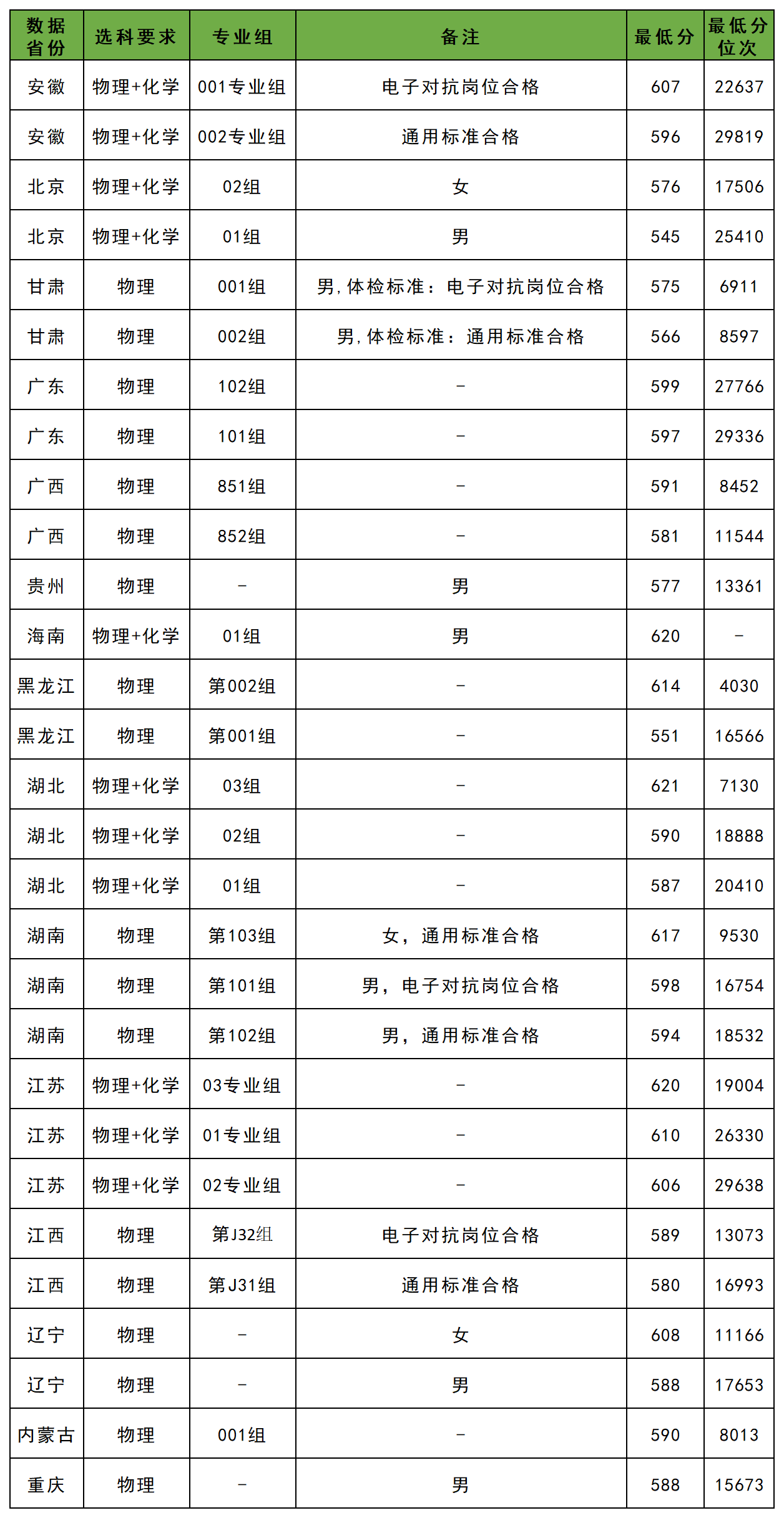 001组607分(电子对抗岗位合格),002组596分(通用标准合格);