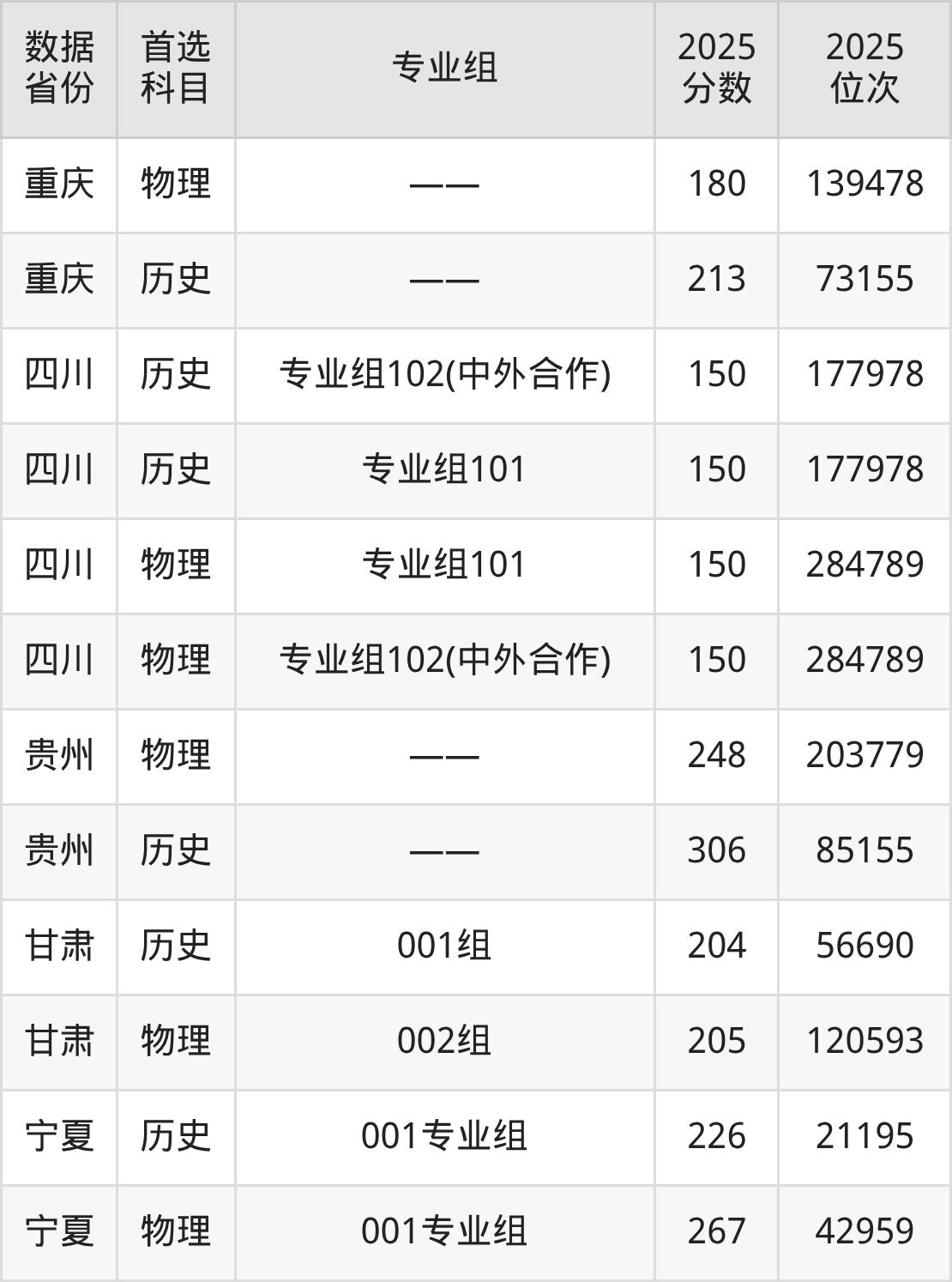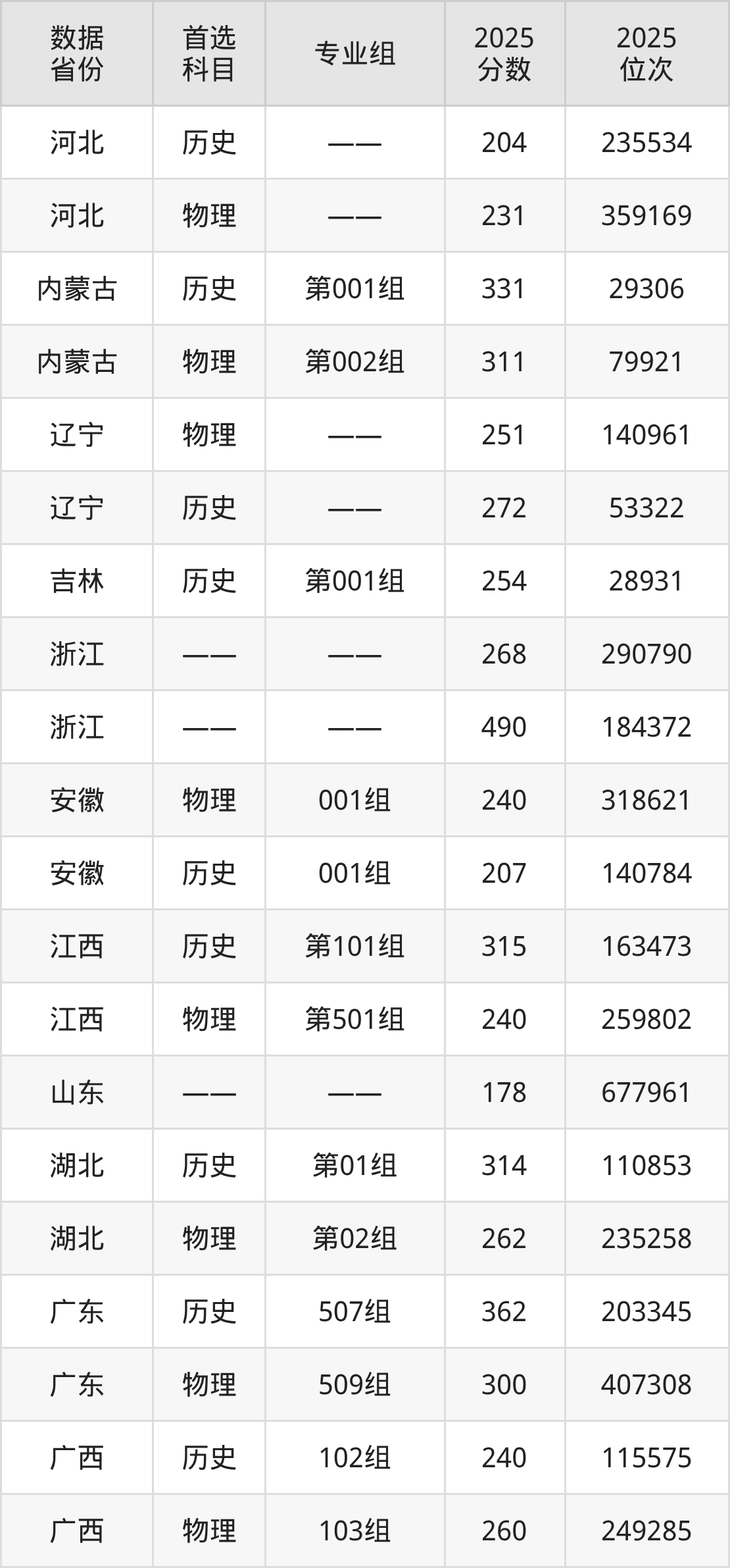 2025年四川城市职业学院全国录取分数线最低是150分,最高是490分,平均分在249分左右。在多数地区录取最低分均超过180分。低于180分能上的地区只有山东和四川,高于平均值较多的是广东、内蒙古、江西和湖北等地,均有专业组最低分在314分及以上。
