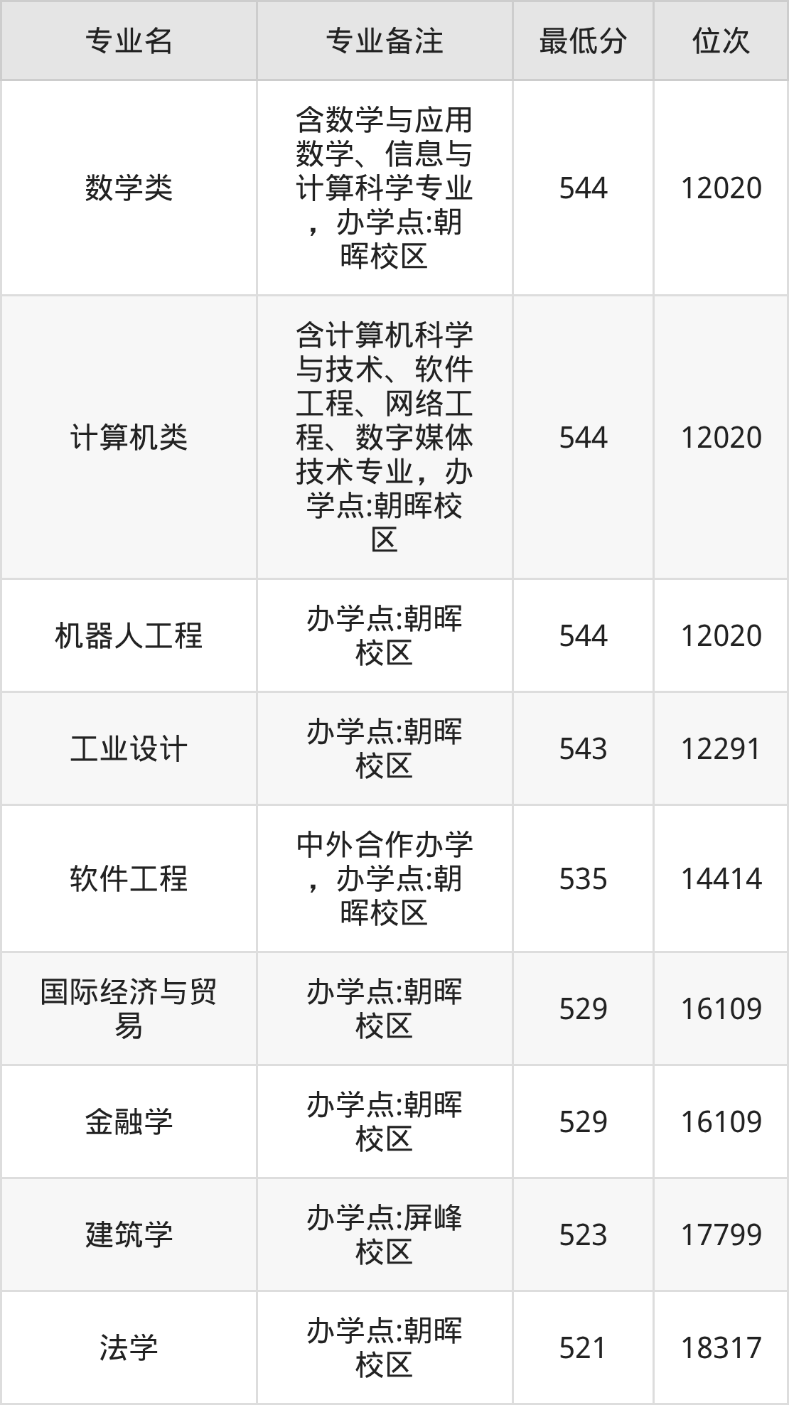 2、计算机类(含计算机科学与技术、软件工程、网络工程、数字媒体技术专业,办学点:朝晖校区):544分、位次12020名;