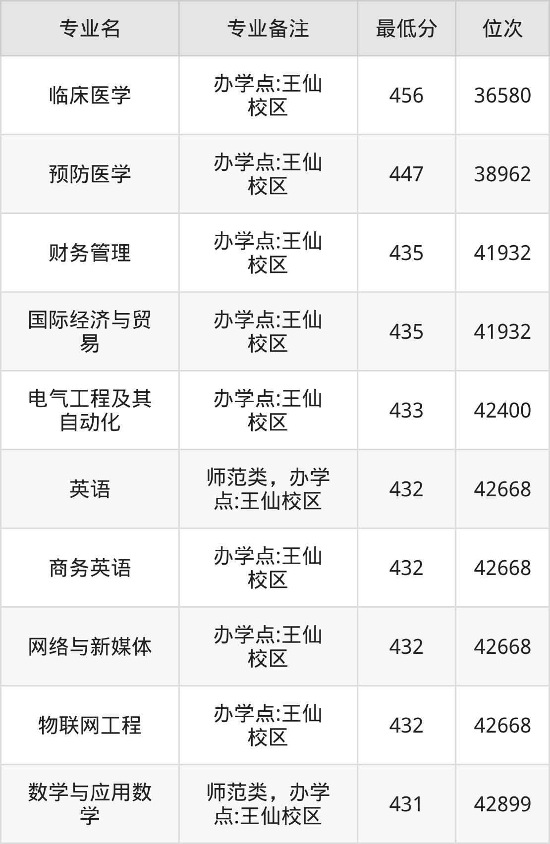 1、临床医学(办学点:王仙校区):456分、位次36580名;