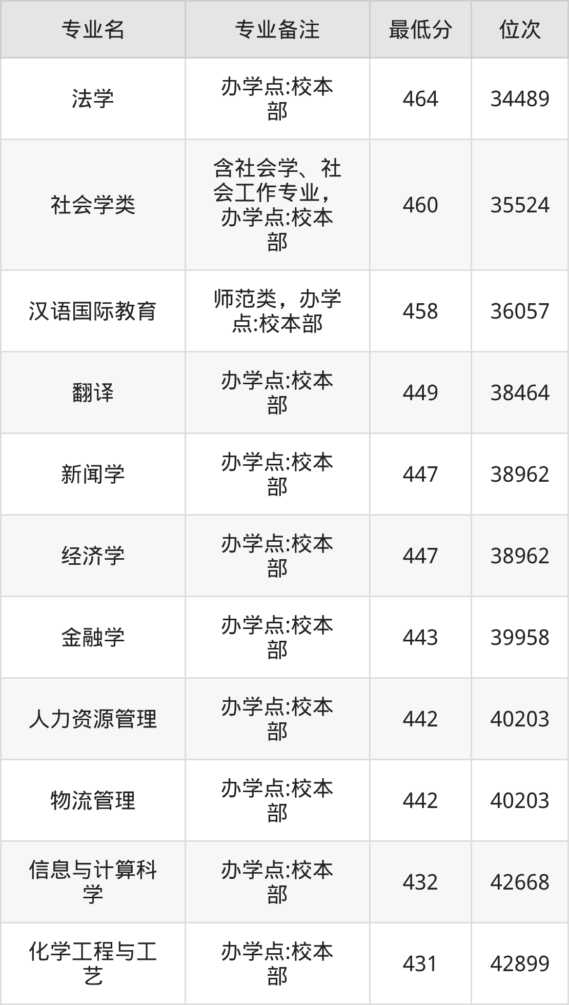 1、法学(办学点:校本部):464分、位次34489名;