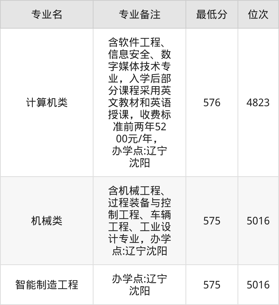 1、计算机类(含软件工程、信息安全、数字媒体技术专业,入学后部分课程采用英文教材和英语授课,收费标准前两年5200元/年,办学点:辽宁沈阳):576分、位次4823名;