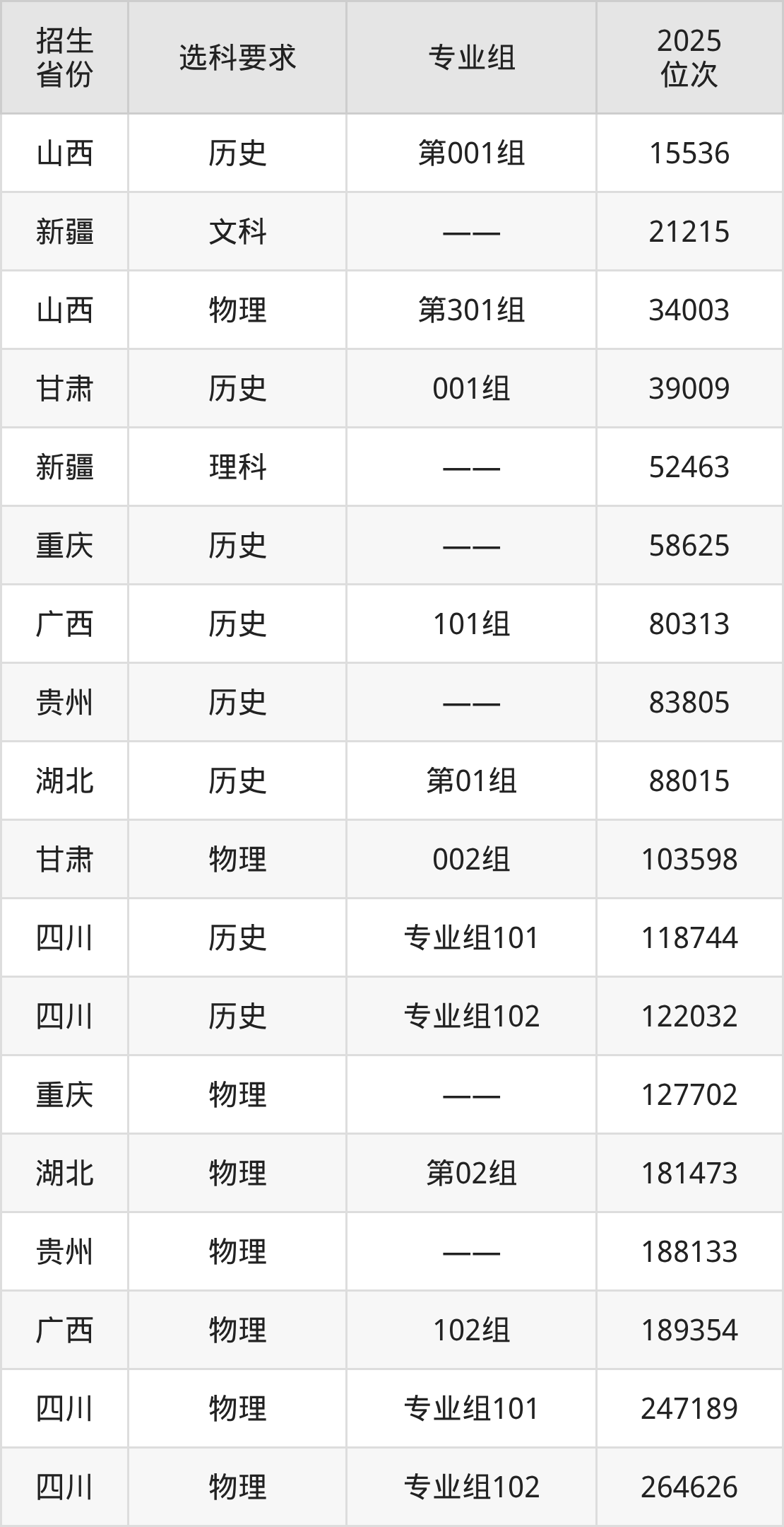 重庆安全技术职业学院2025年在全国各省的位次差异较大,最高位次是15536位(山西历史类)、最低位次是264626位(四川物理类)。各省具体位次请看下图:
