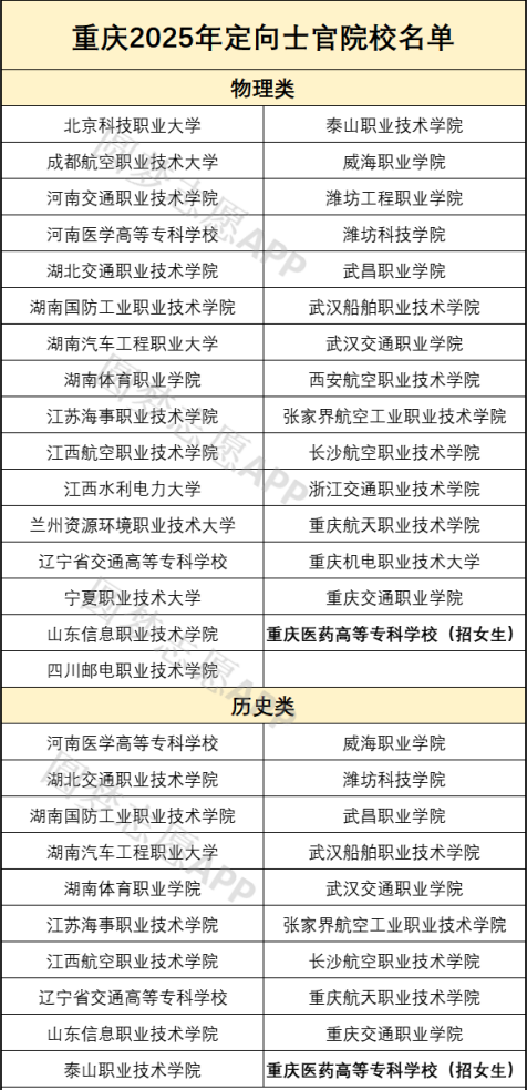 最新一年招生计划显示,定向士官在重庆市招生院校中,物理类招生院校31所、历史类招生院校20所,不同院校招生人数、专业、类型等都有差异,为方便2026届考生报考,下面将详细列举这些学校的名单,供查阅: