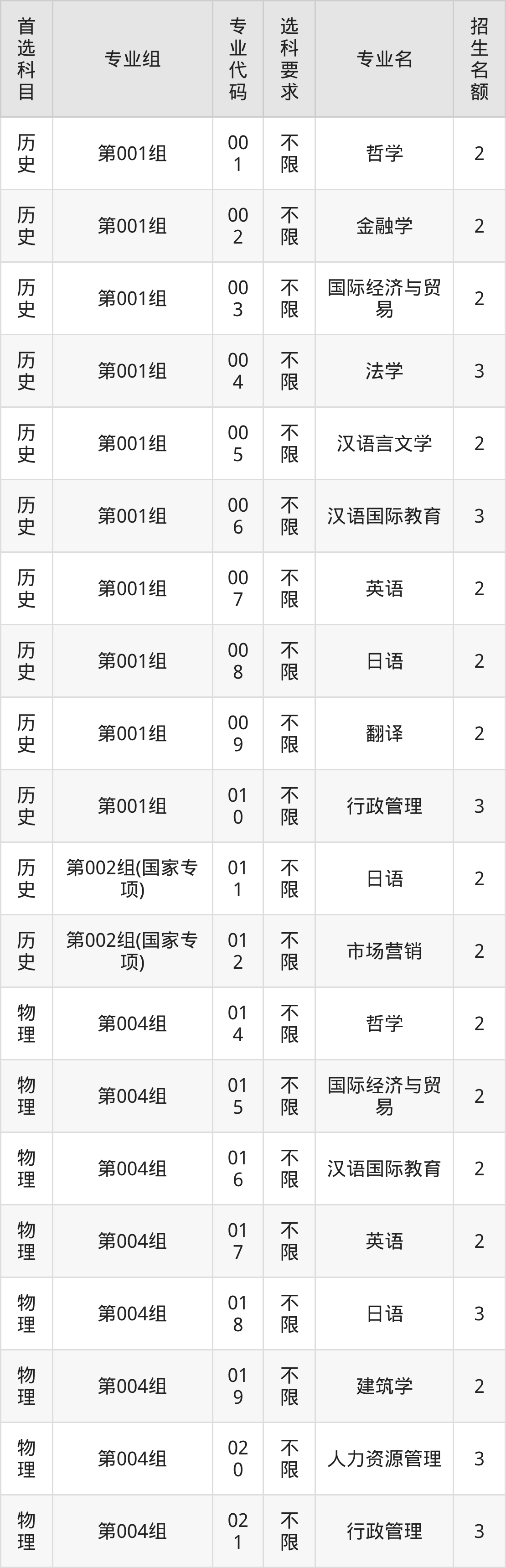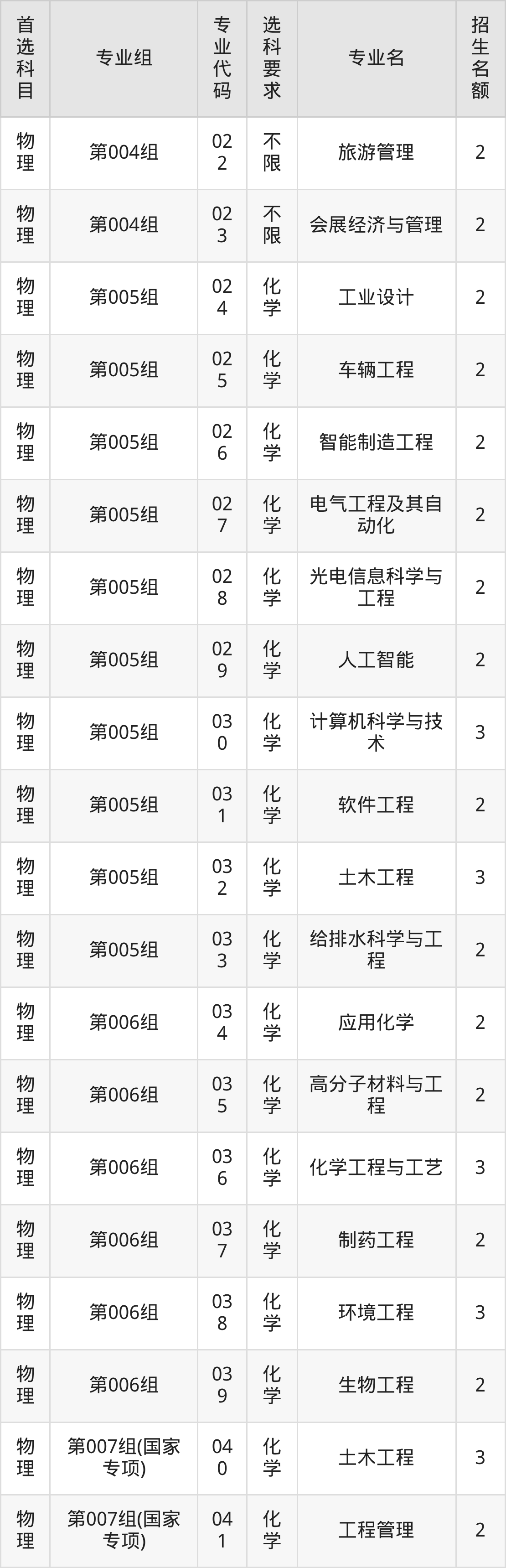 各专业选科要求、招生名额汇总如下:
