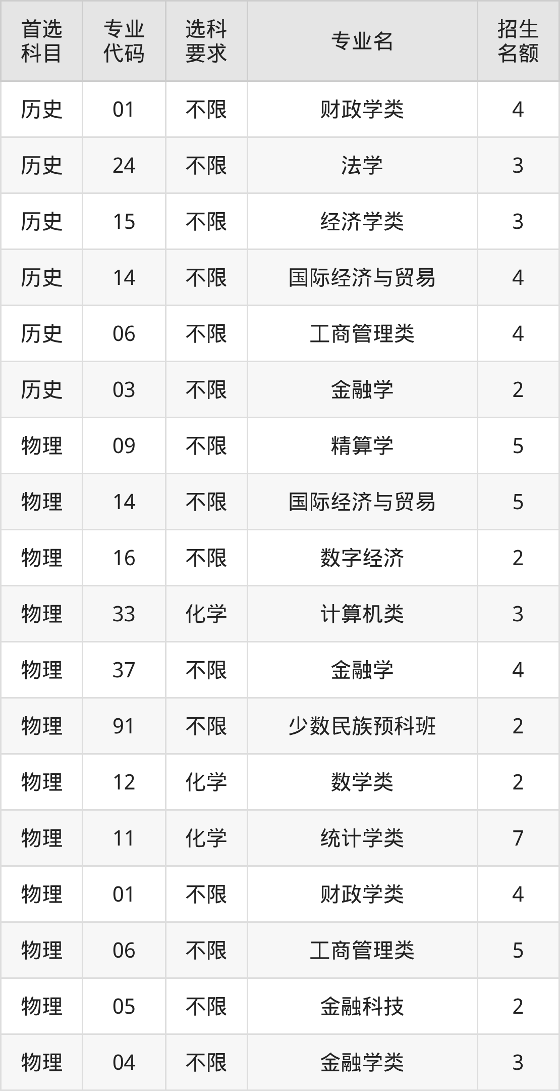各专业选科要求、招生名额汇总如下: