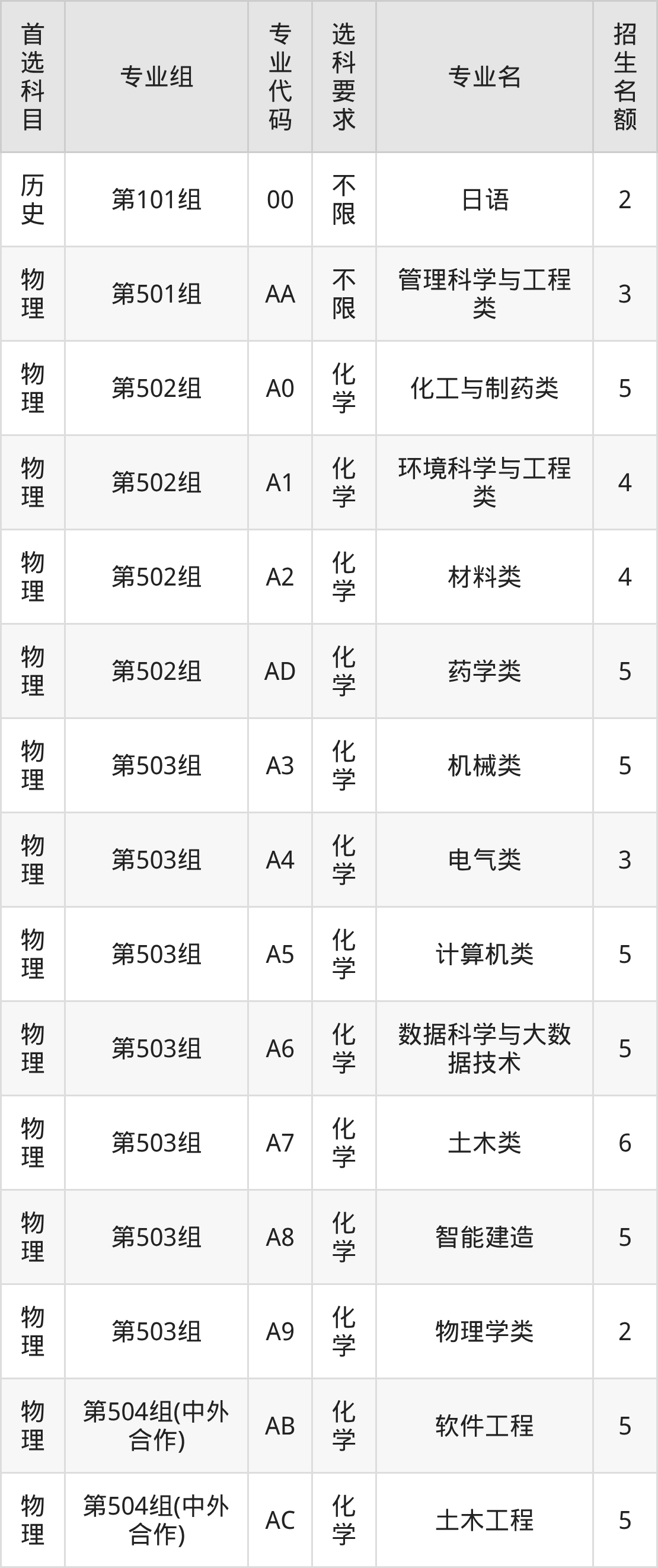 各专业选科要求、招生名额汇总如下:
