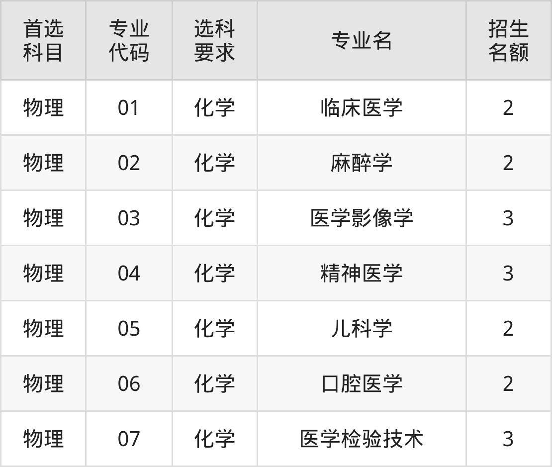 各专业选科要求、招生名额汇总如下: