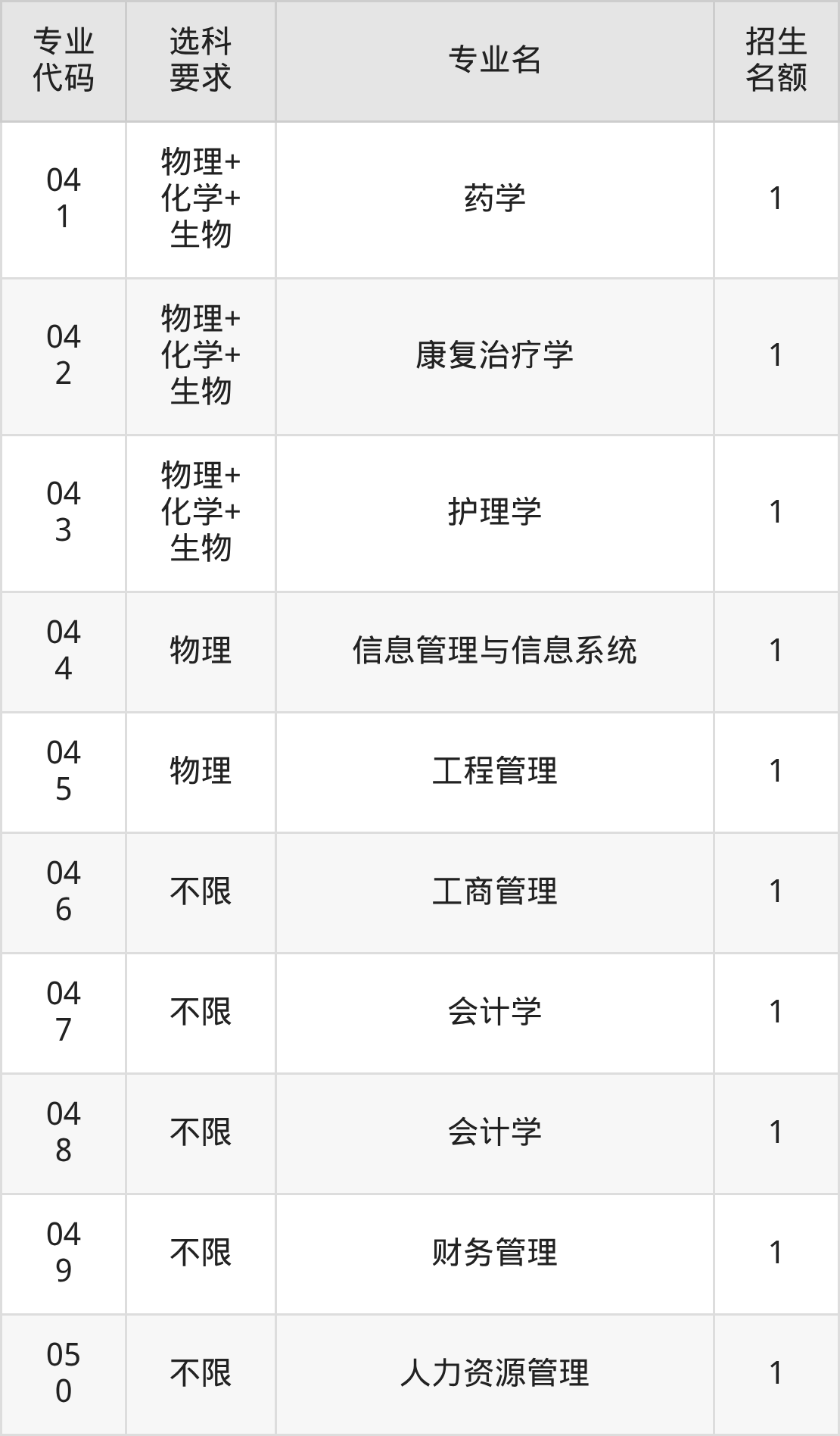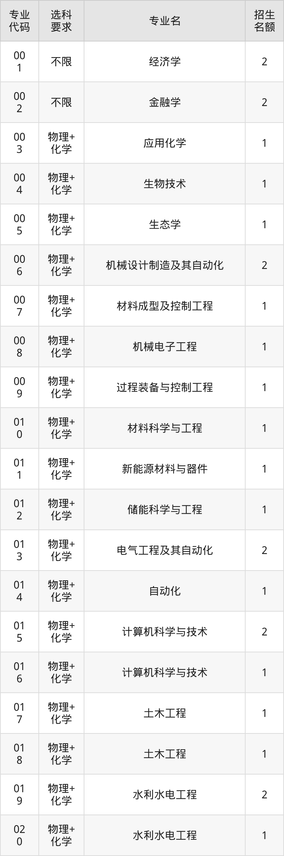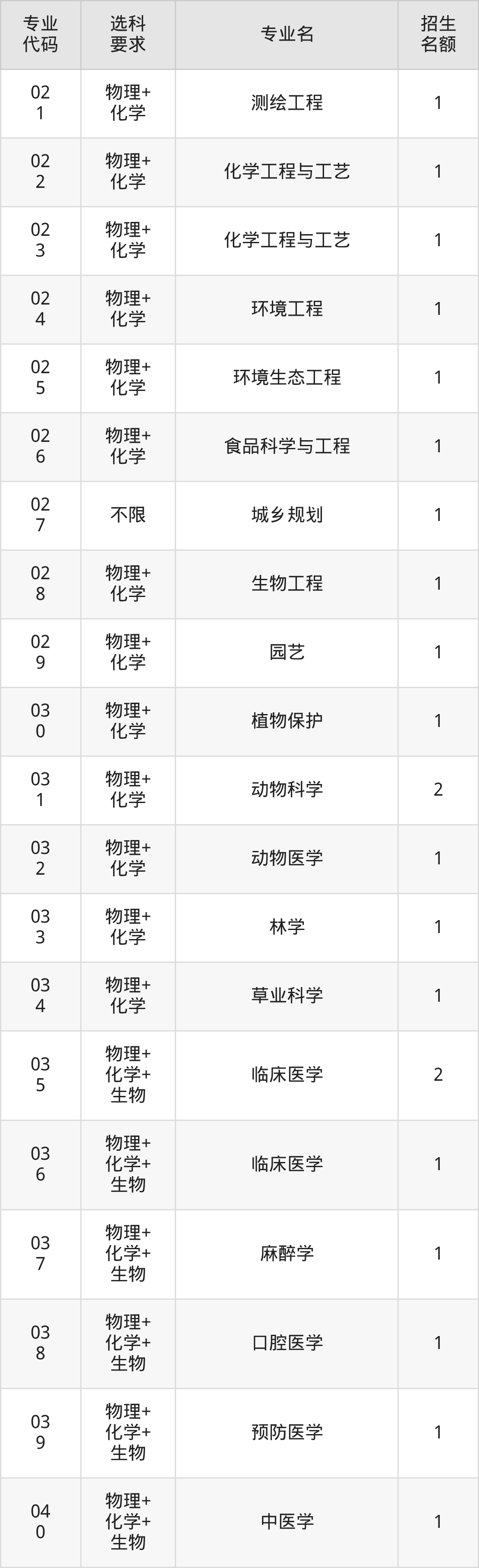 各专业选科要求、招生名额汇总如下: