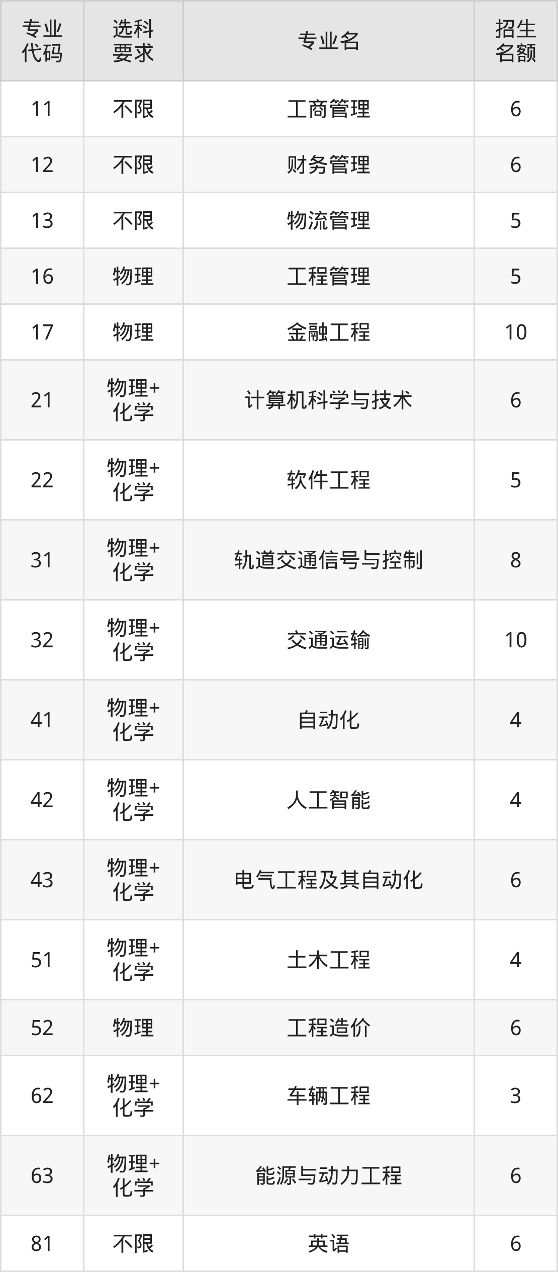各专业选科要求、招生名额汇总如下: