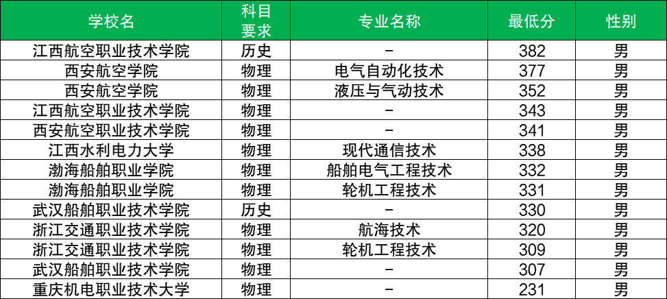 物理类:最低分352分,对应最低分专业是液压与气动技术,招生性别为男;