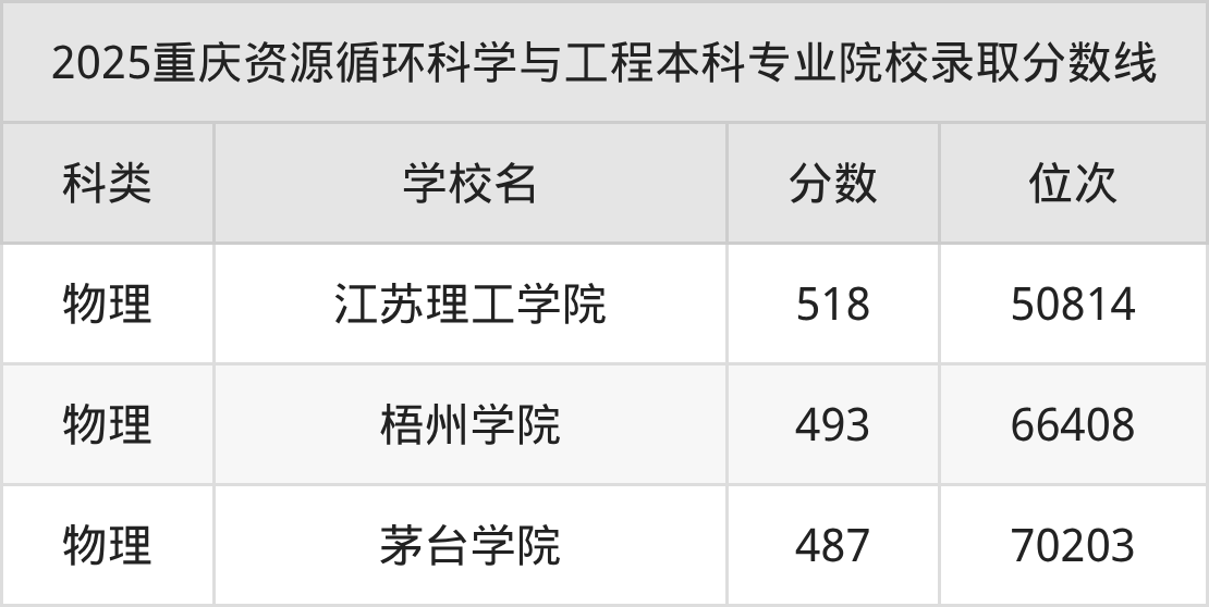 2025年重庆资源循环科学与工程本科专业招生院校有3所,分数最低的是茅台学院(487分、物理类位次70203名),分数最高的是江苏理工学院(518分、物理类位次50814名)。