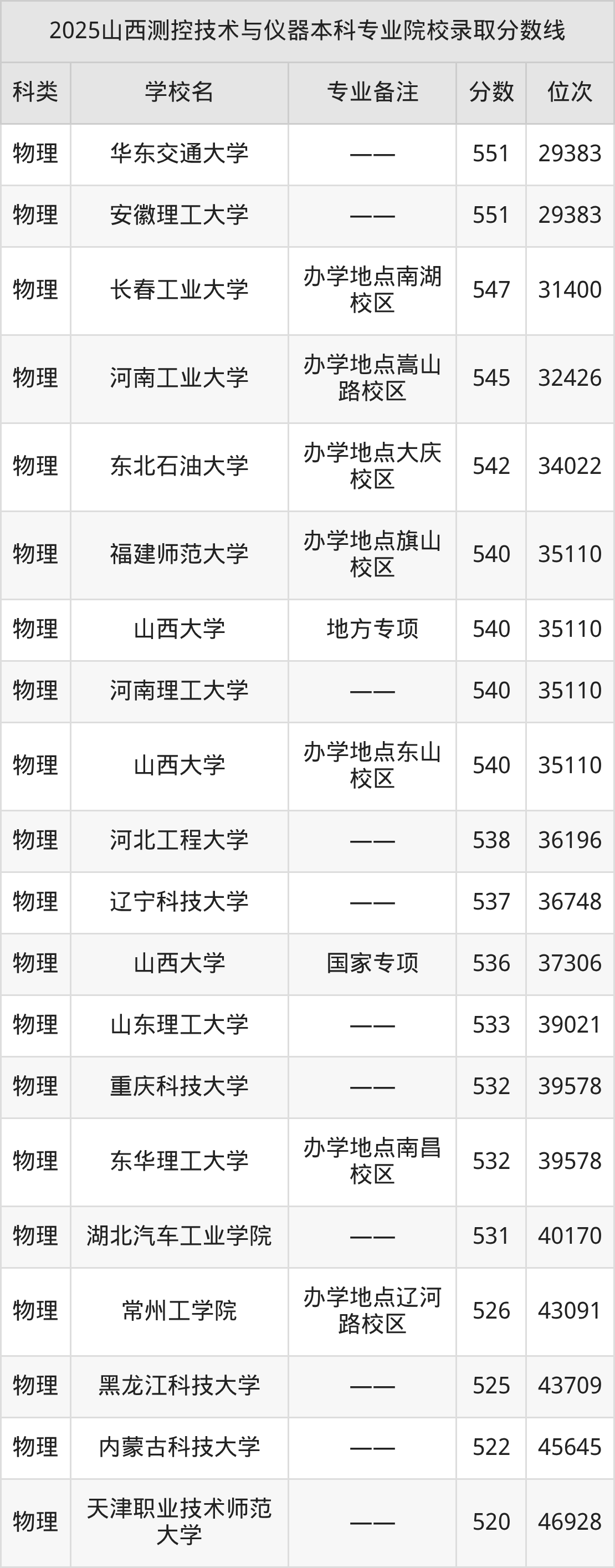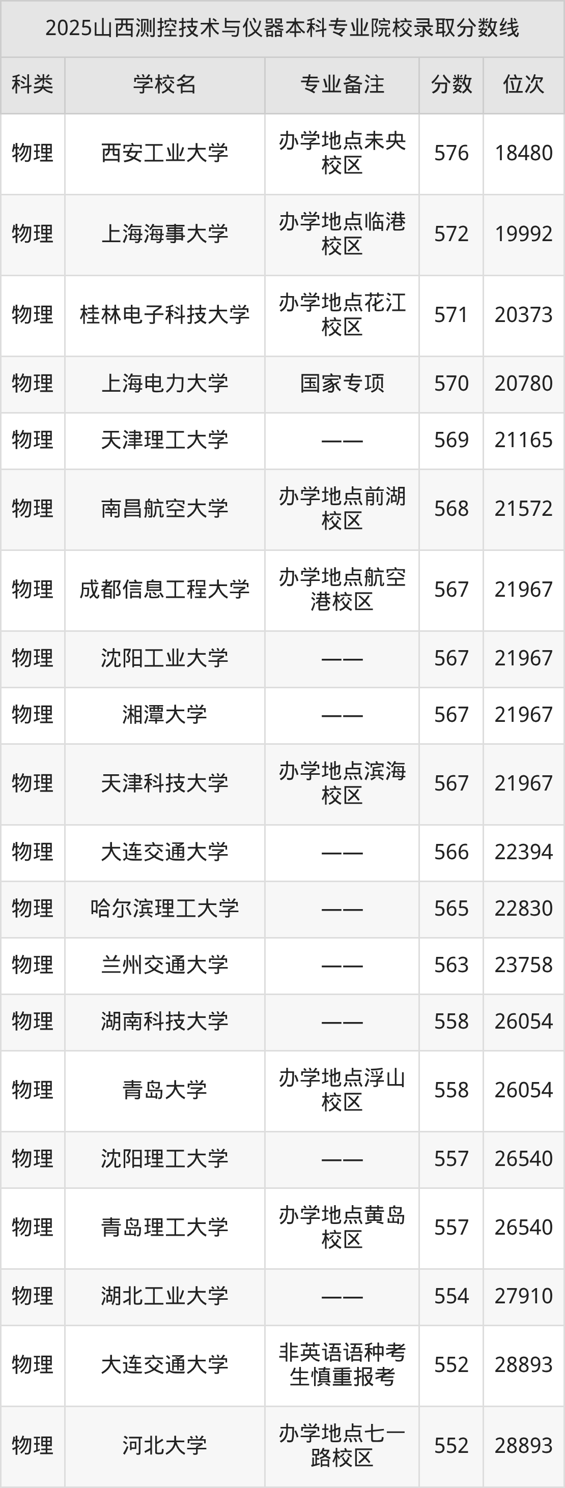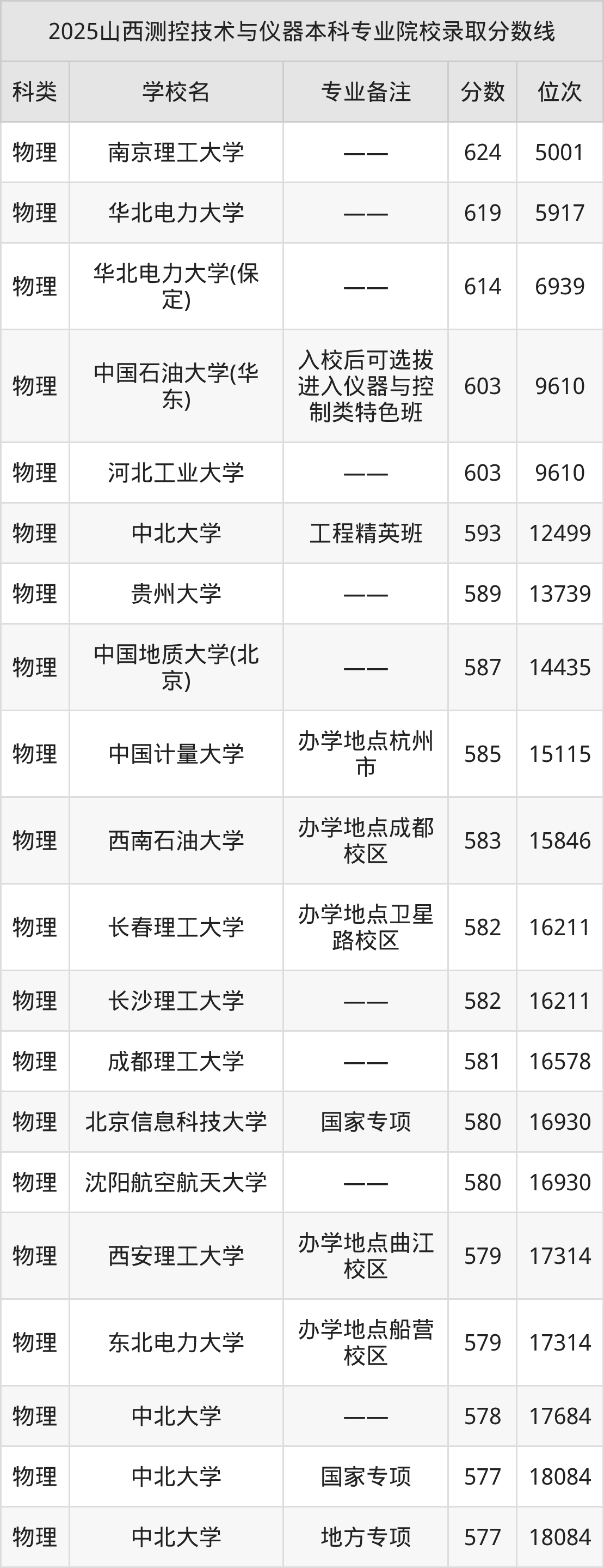 2025年山西测控技术与仪器分数线排名前5的大学名单(本科最难报考):
