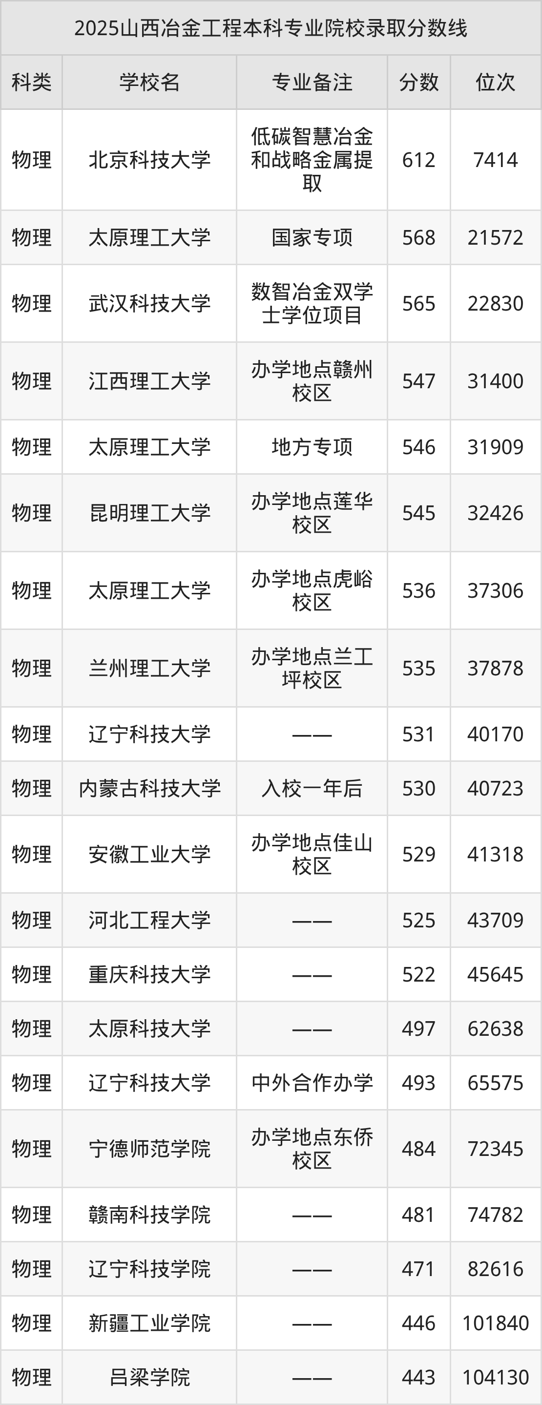 2025年山西冶金工程本科专业招生院校有17所,分数最低的是吕梁学院(443分、物理类位次104130名),分数最高的是北京科技大学(612分、物理类位次7414名)。