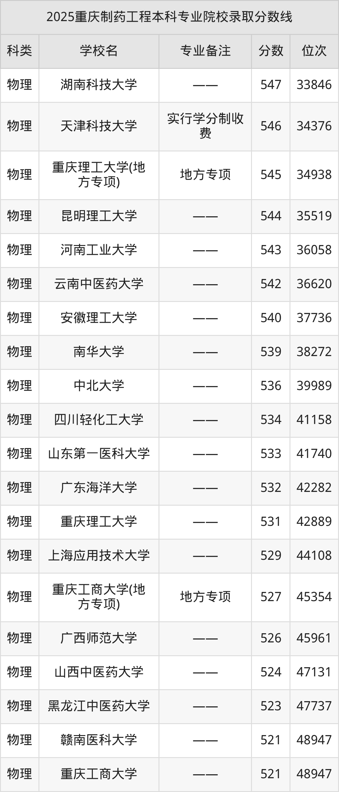 2025年重庆制药工程分数线排名前5的大学名单(本科最难报考):