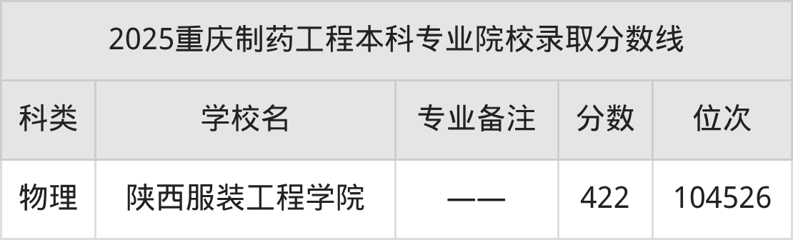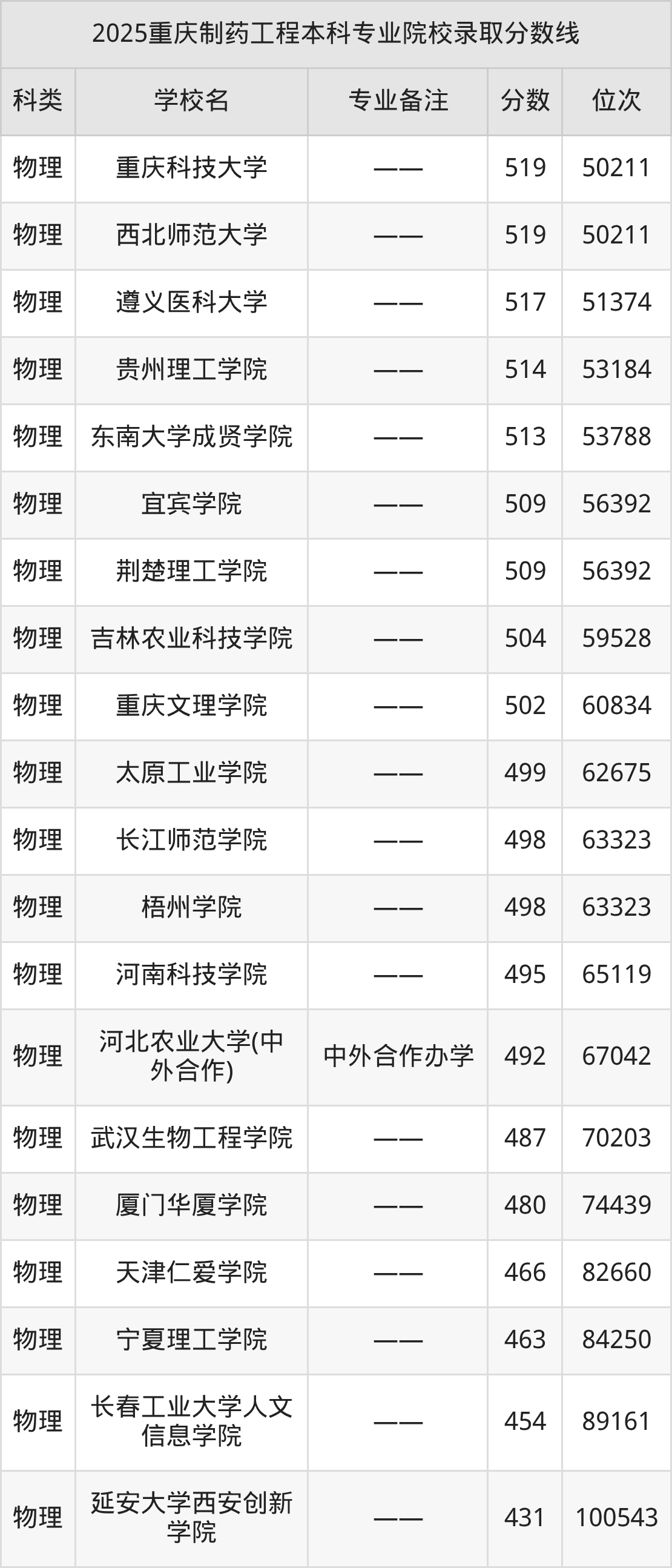 2025制药工程专业在重庆市录取分数线为:本科422分-602分。结合批次线来看,低于本科线3分也有机会就读制药工程本科专业,低分录取的本科院校有陕西服装工程学院。2026届考生可在下文查阅更多院校名单、分数及排名信息。