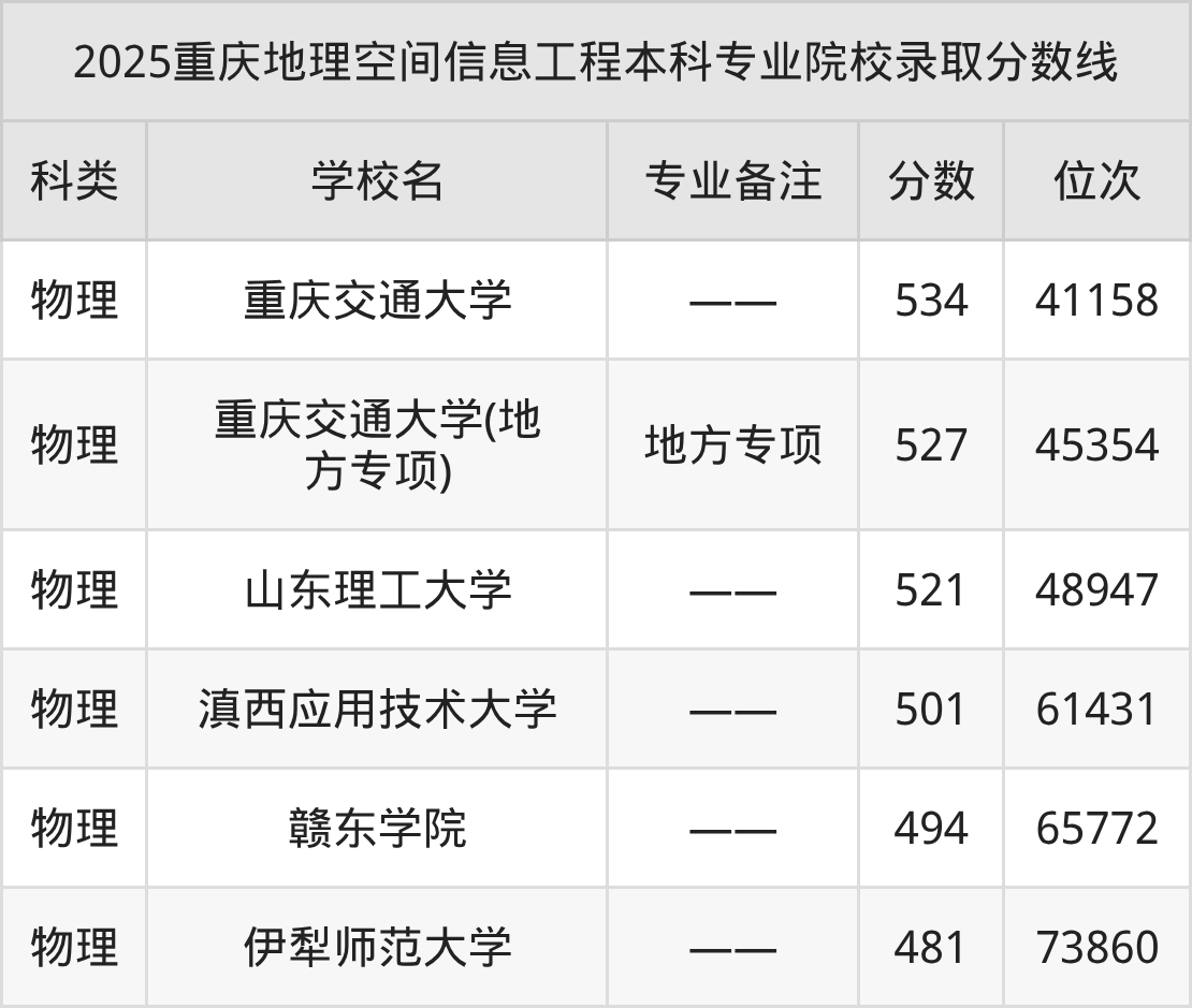 1、重庆交通大学:地理空间信息工程534分、物理类位次41158名;