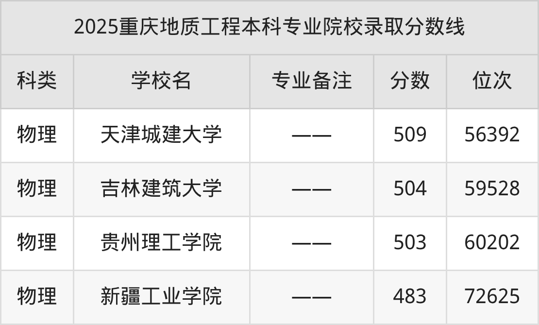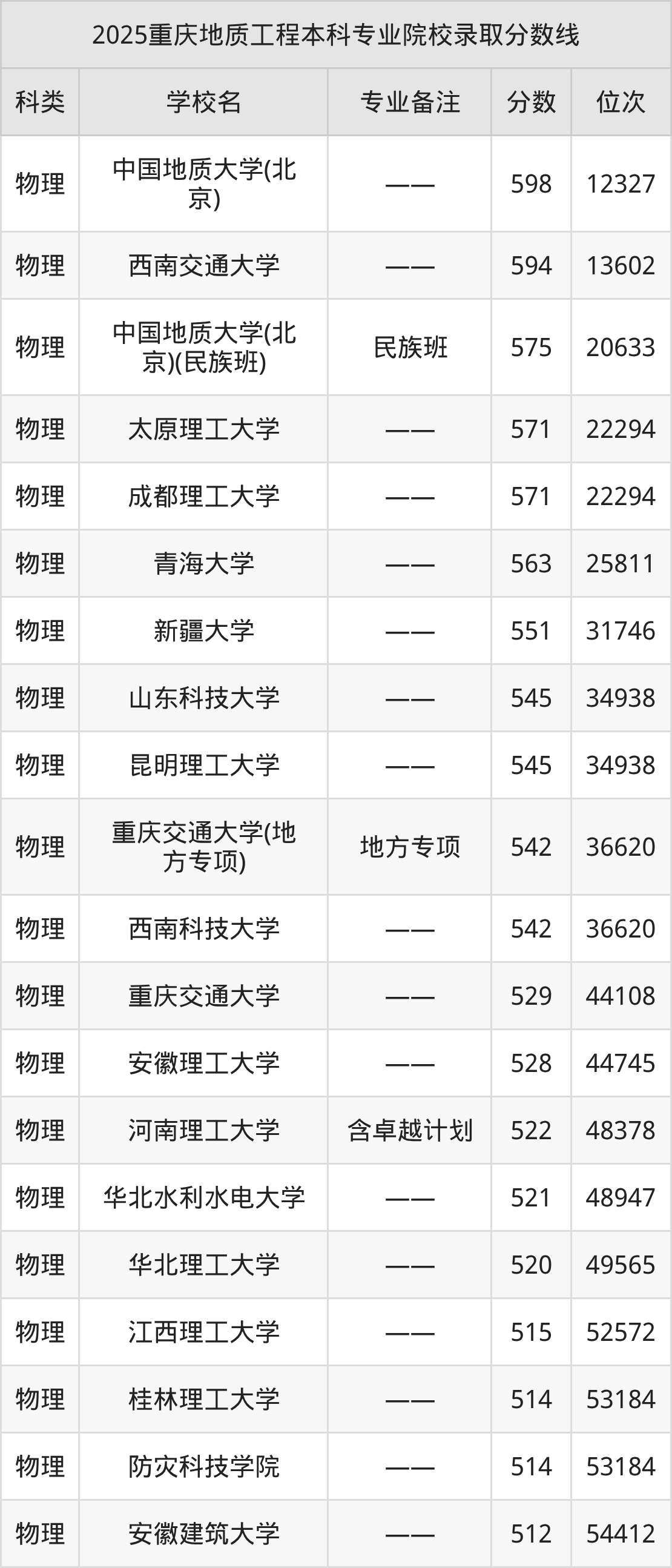 2025地质工程专业在重庆市录取分数线为:本科483分-598分。结合批次线来看,考生成绩超本科线58分及以上即有机会就读地质工程本科专业,低分录取的本科院校有新疆工业学院。2026届考生可在下文查阅更多院校名单、分数及排名信息。