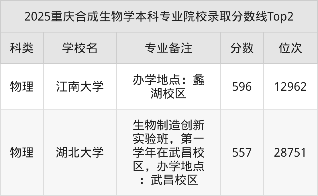 2025年重庆合成生物学分数线排名前2的大学名单(本科最难报考):